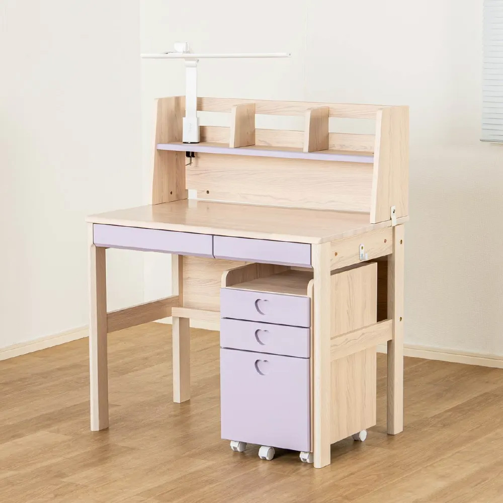 無垢の天然木を生かした、木の温かみとやさしさを感じるデザインに仕上がっています。デスク本体の引出しは広い奥行で大きなものをたっぷりと収納出来ます。