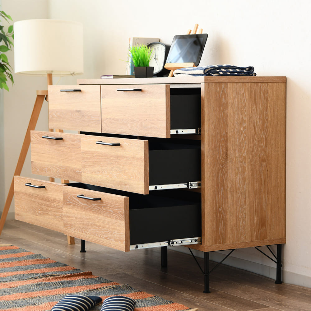 ◆表面材、側面、天板は、MDFにオーク柄の強化シート張り仕上げです。◆引き出しは、丈夫な箱組作りで、出し入れスムーズなフルオープンレール付き。