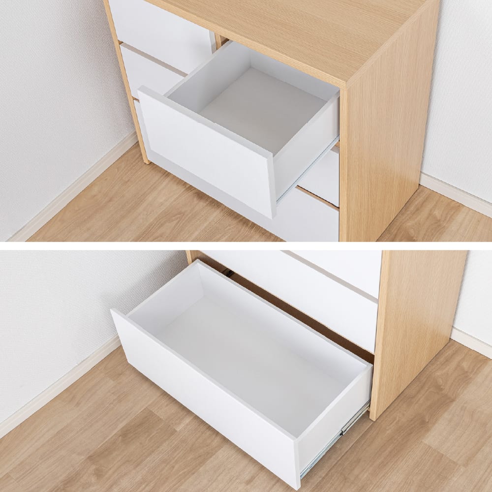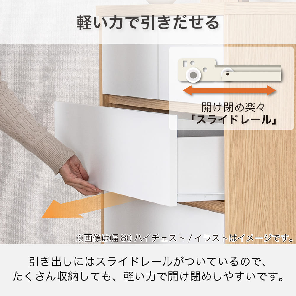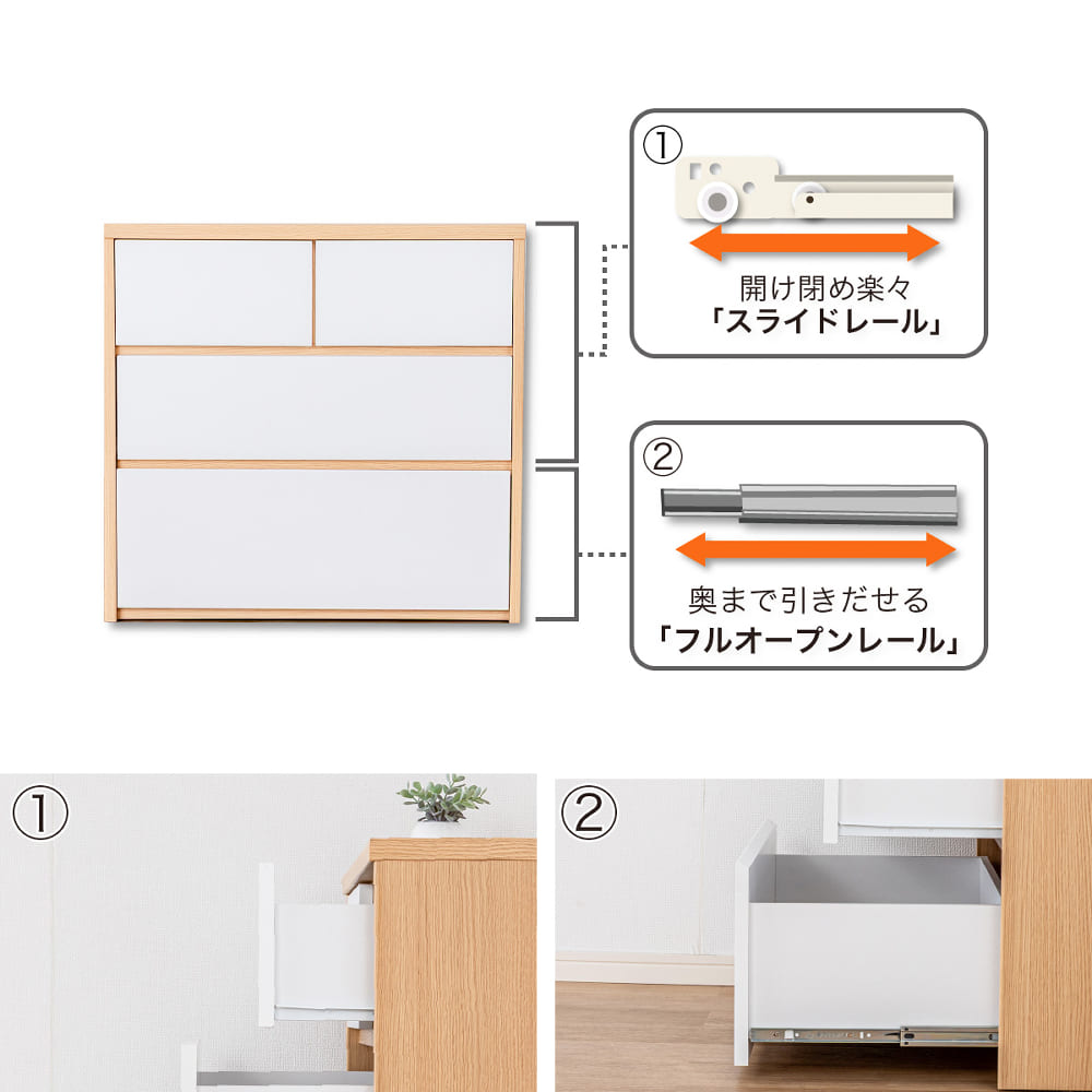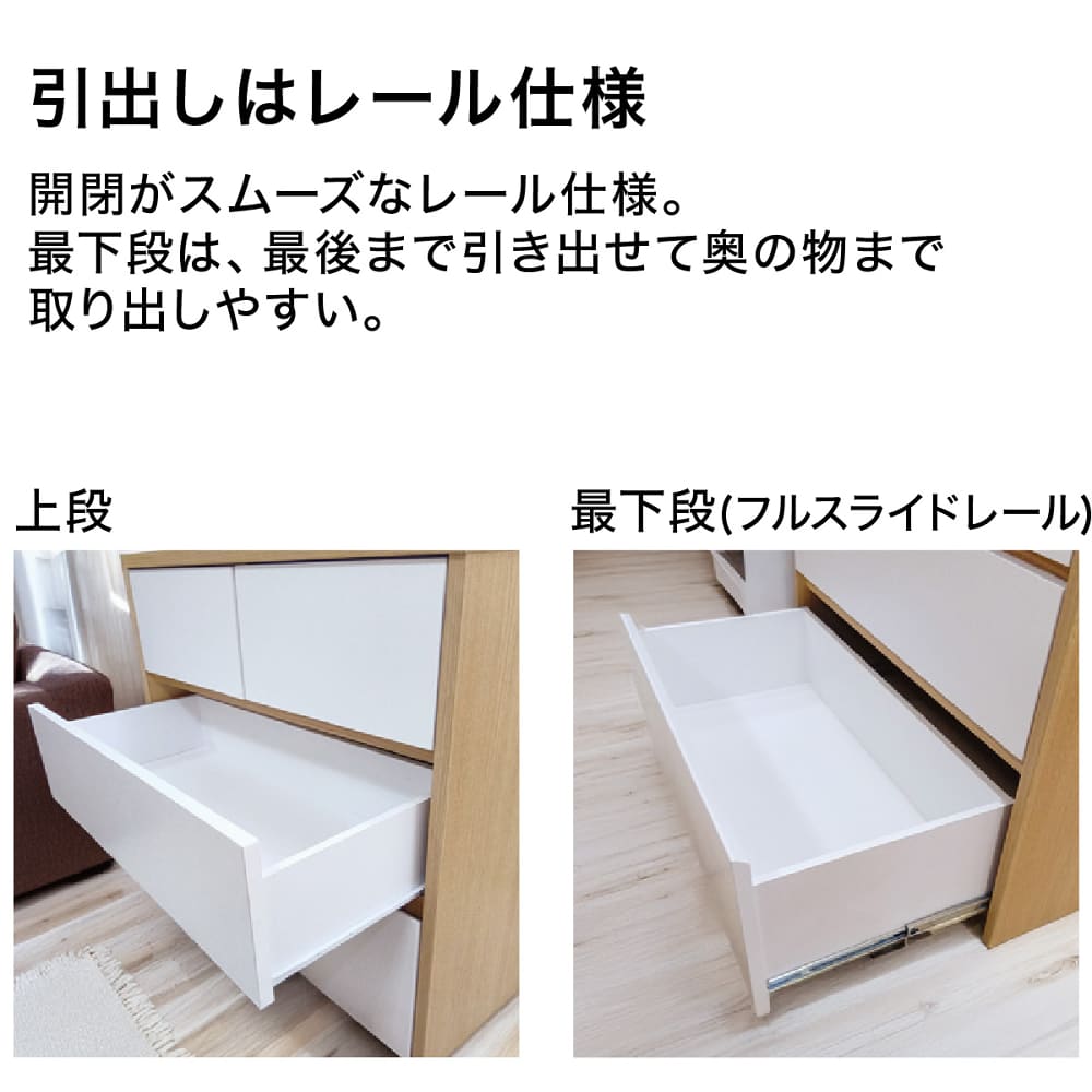 ◆上段には軽い力で引きだしやすいスライドレールを採用◆最下段は奥の物まで取り出しやすいフルスライドレールを採用