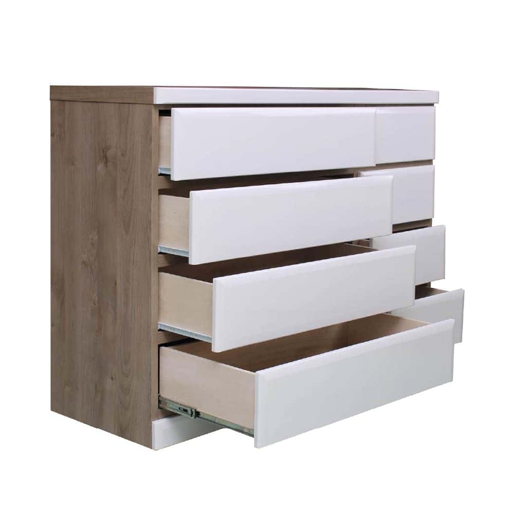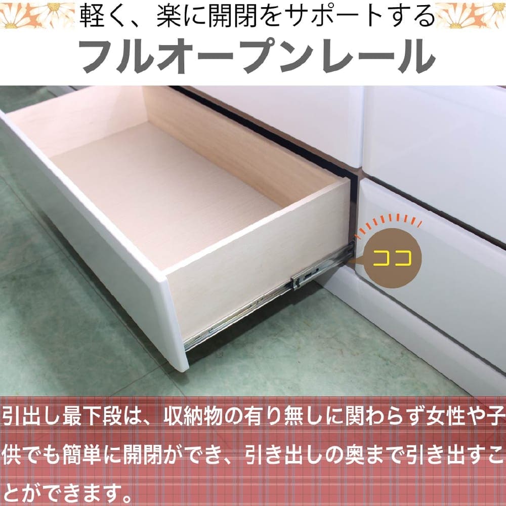 ◆最下段の大引出しはスライドレール仕様になっておりますので、女性やお子さまでもスムーズに開閉ができます。◆前面は、エナメル塗装仕上げとなっております。