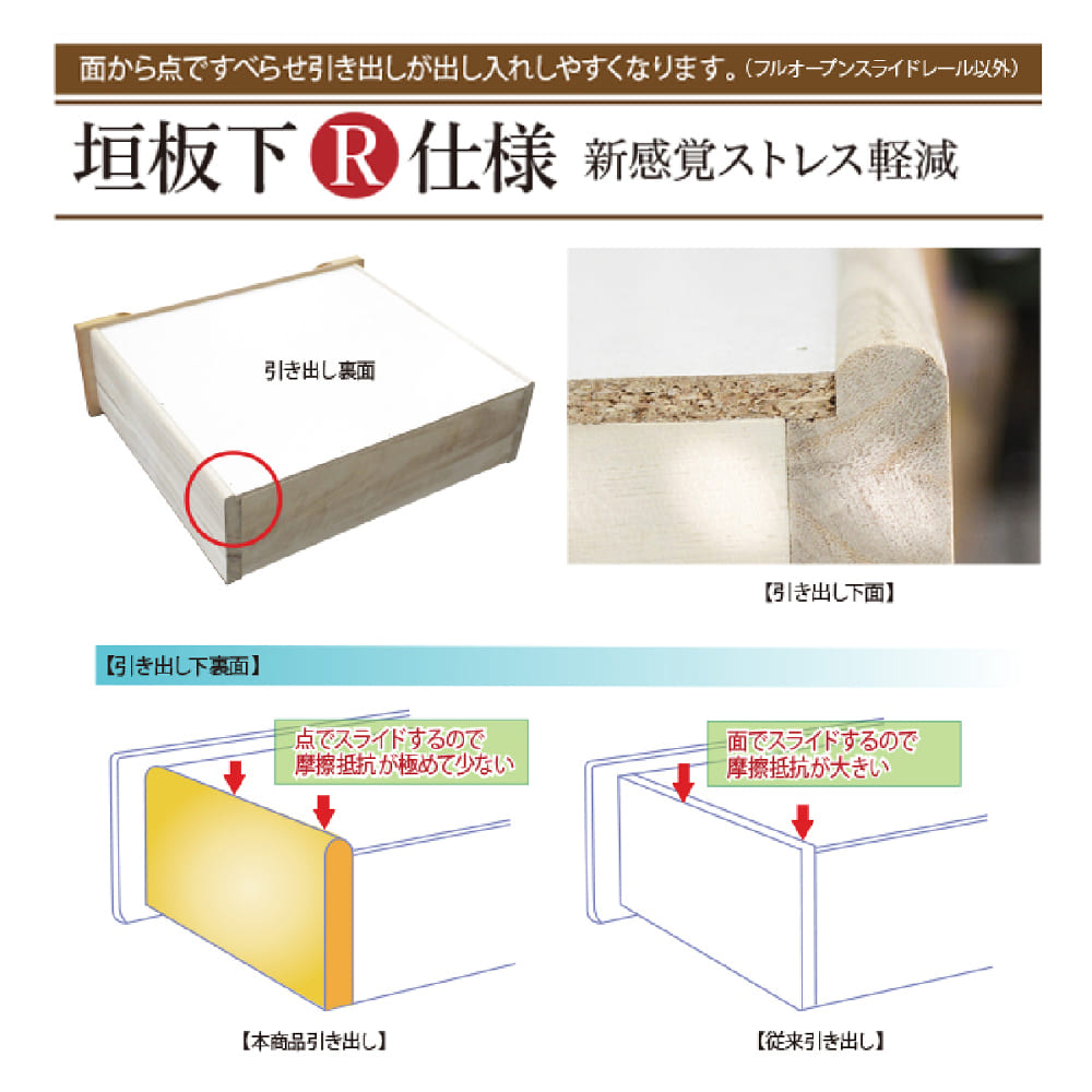 ◆引出レールなし部分には、垣板をアールにすることで摩擦を軽減しスムーズに開閉する事ができます
