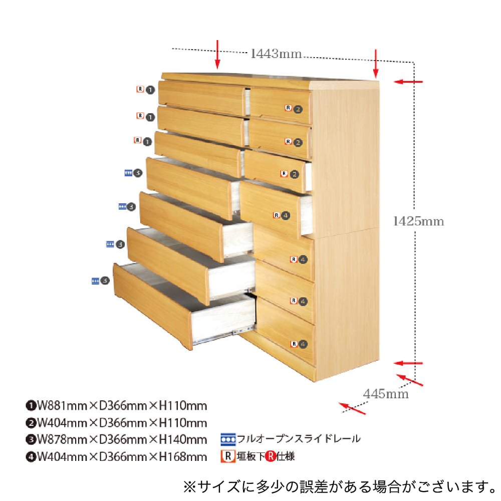 ◆下4段の大引出しはフルオープンレール仕様になっておりますので、スムーズに引出しが開閉できます◆引出しは、箱組になっておりますので、強度があり、耐久性に優れております