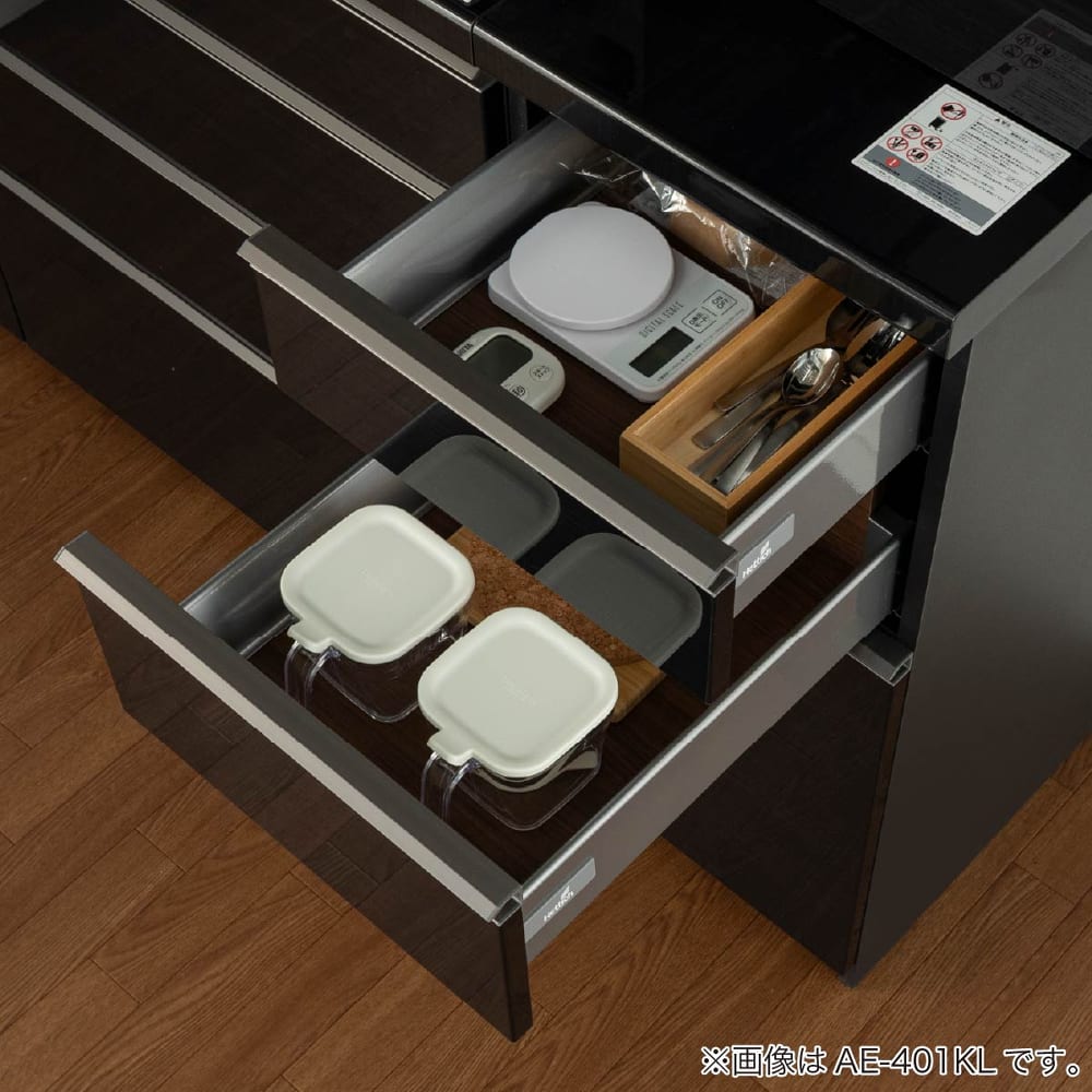 ◆最上級グレードASシリーズをイノテック引出仕様のハイグレード一体型にした商品です。◆アウトセット引戸の上台はアルミフレームをきわめて薄くした、軽さとスタイリッシュさを追求した上台です。