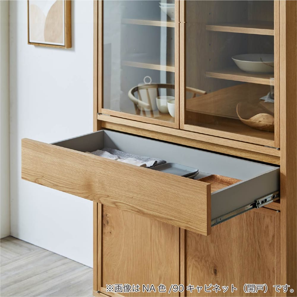 ◆戸枠/ホワイトオーク節有無垢材。引出・板戸前板・カウンターTOP/ホワイトオーク節有突板。◆開き戸のガラス(t3mm)は透明のフィルム貼りの為、万が一ガラスが割れても飛び散らず安全です。