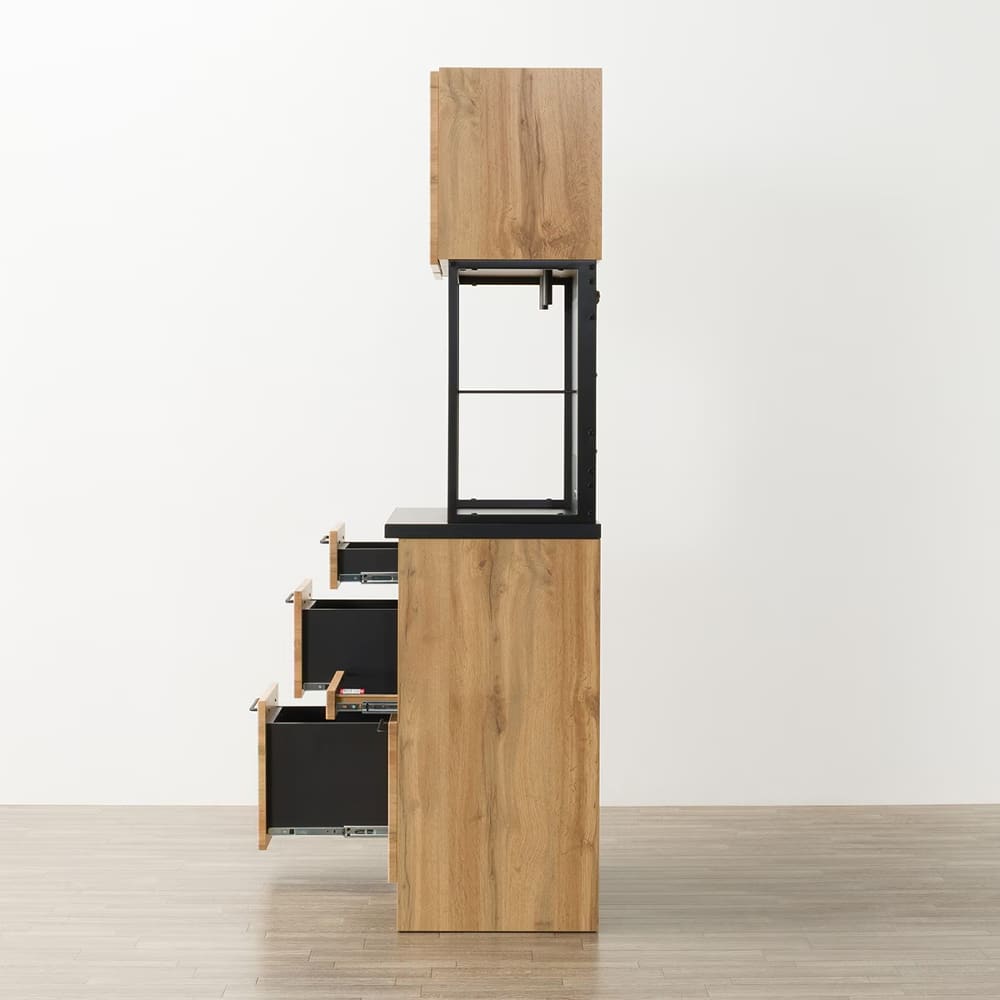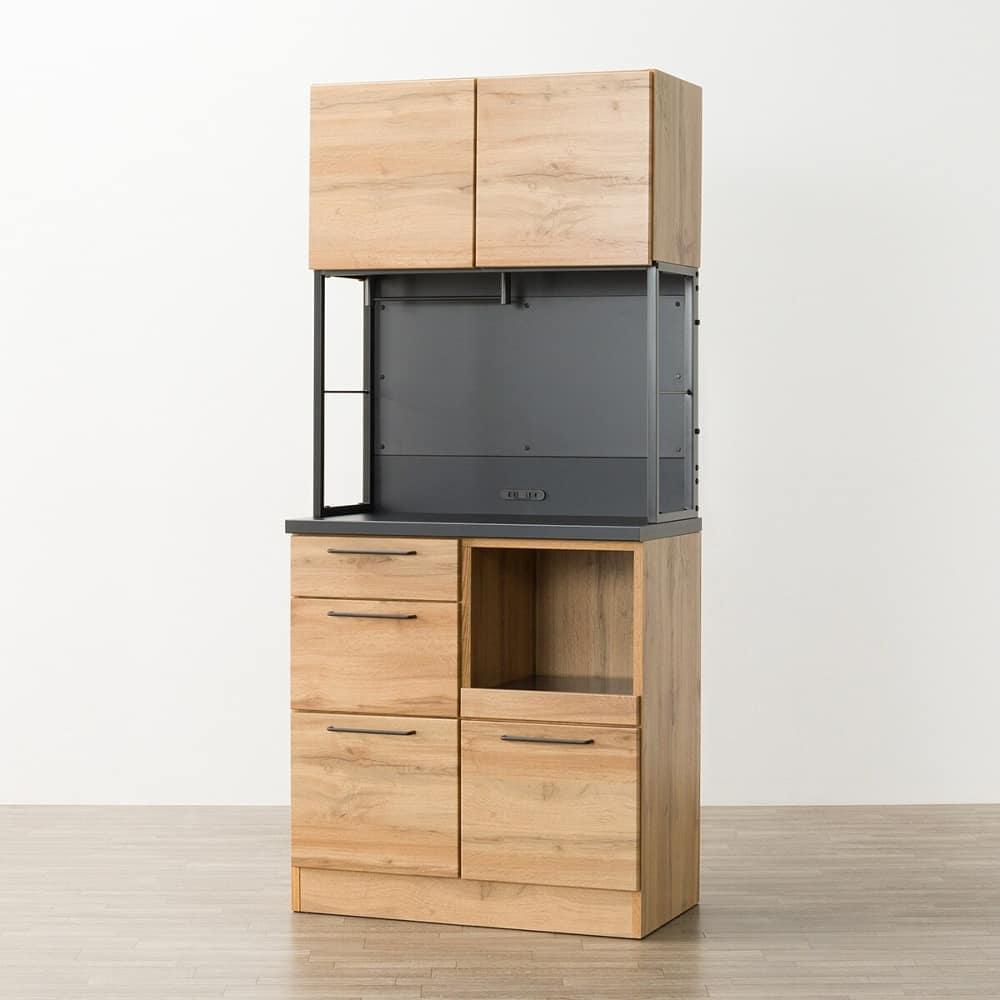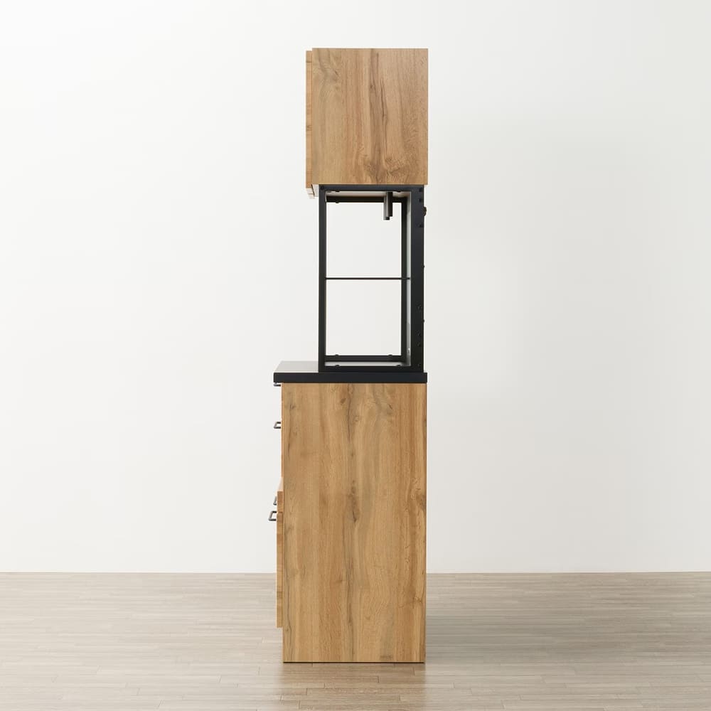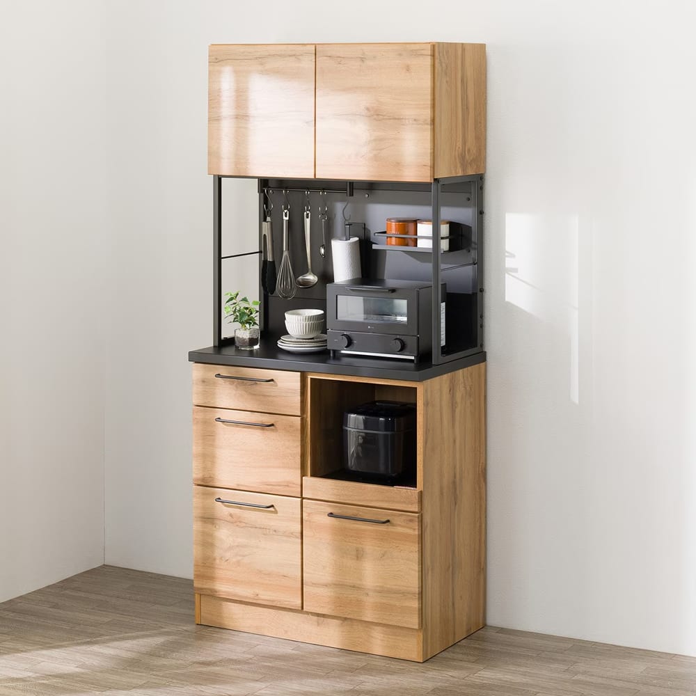 ◆木目とブラックカラーを組み合わせた、モダンなデザインのキッチンボードです。ヴィンテージ風やカフェ風など、お好みに合わせて自由にコーディネートできるのが魅力です。◆高さを抑えたコンパクトタイプで、上台収納にも手が届きやすい仕様です。