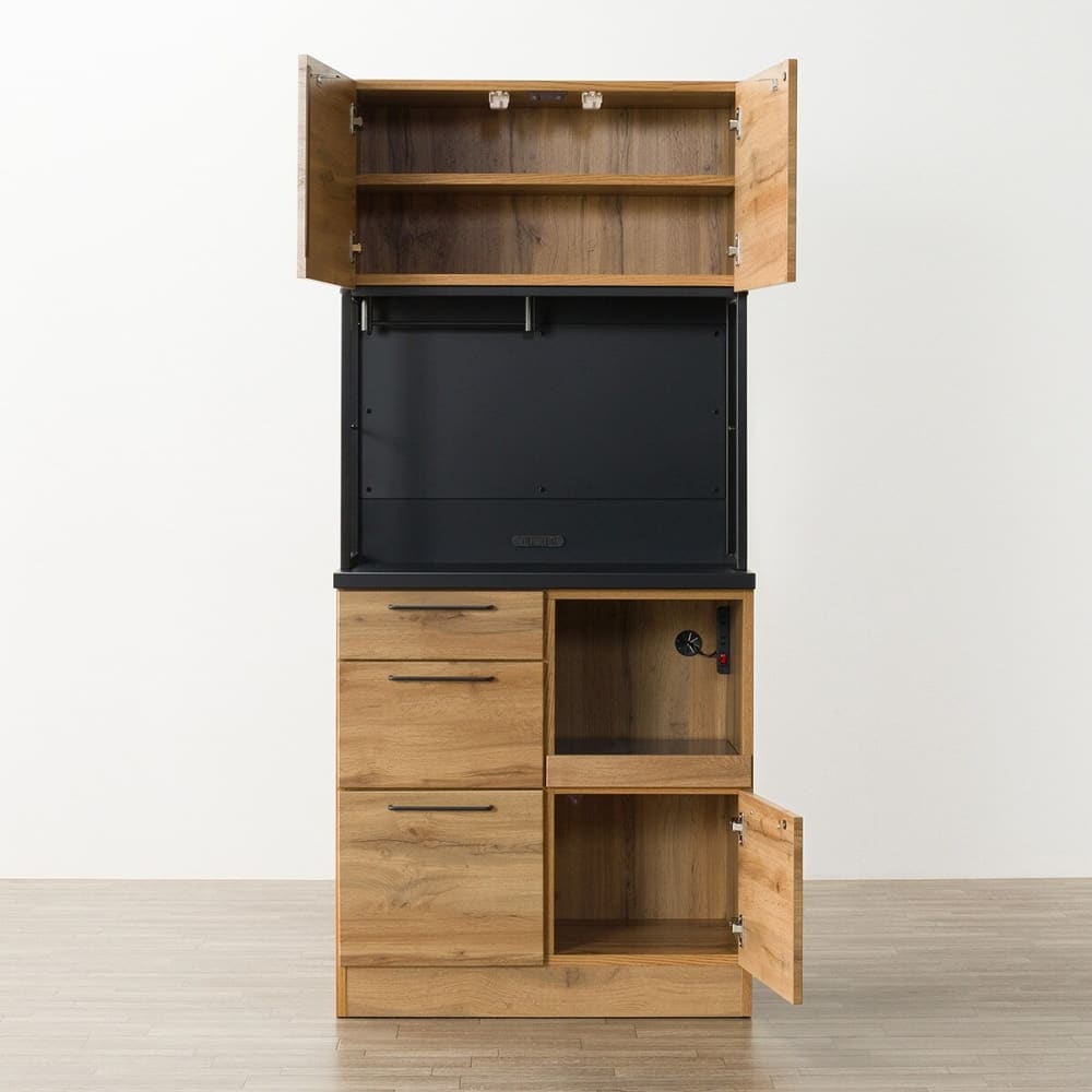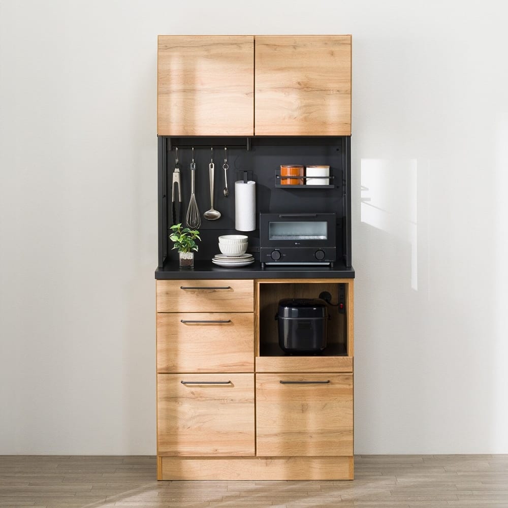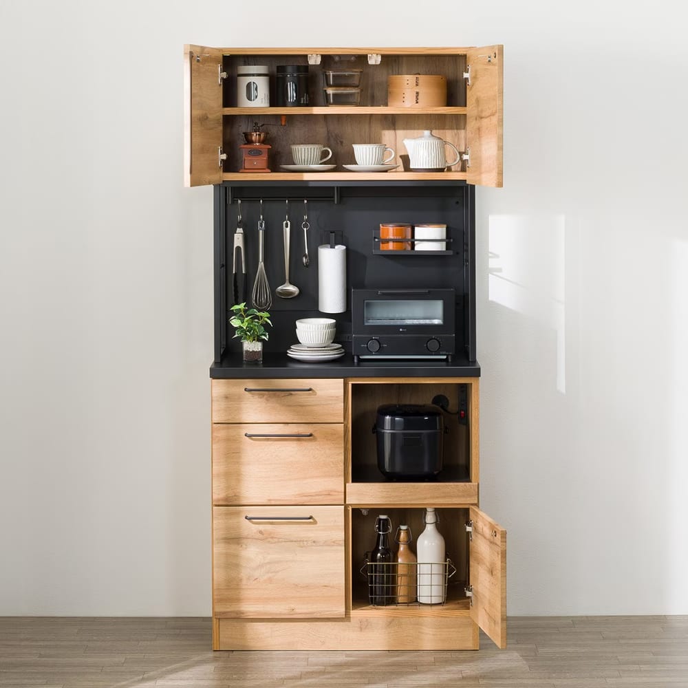 ◆また、下段は炊飯器など蒸気の出る調理家電の設置に便利なスライドテーブル式を採用。コンセントは中段部分に2口、さらに下段のオープンスペースにも付いているので、電子レンジやトースター、炊飯器や電気ポットなど複数の家電を同時に使いやすく、配線もすっきりまとめることができます。使う場所の近くにコンセントがあることで、コードがごちゃつかず、見た目もきれいに整います。