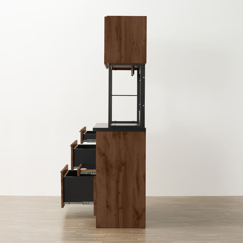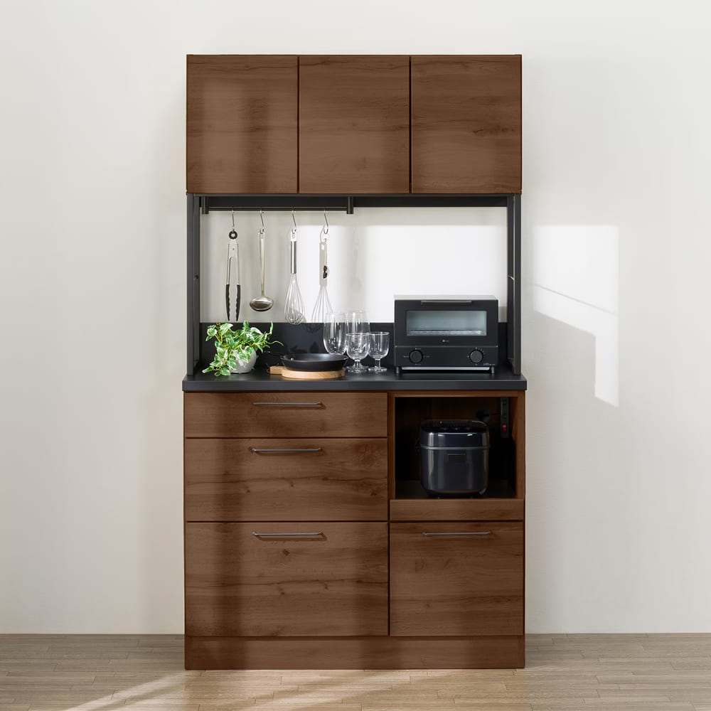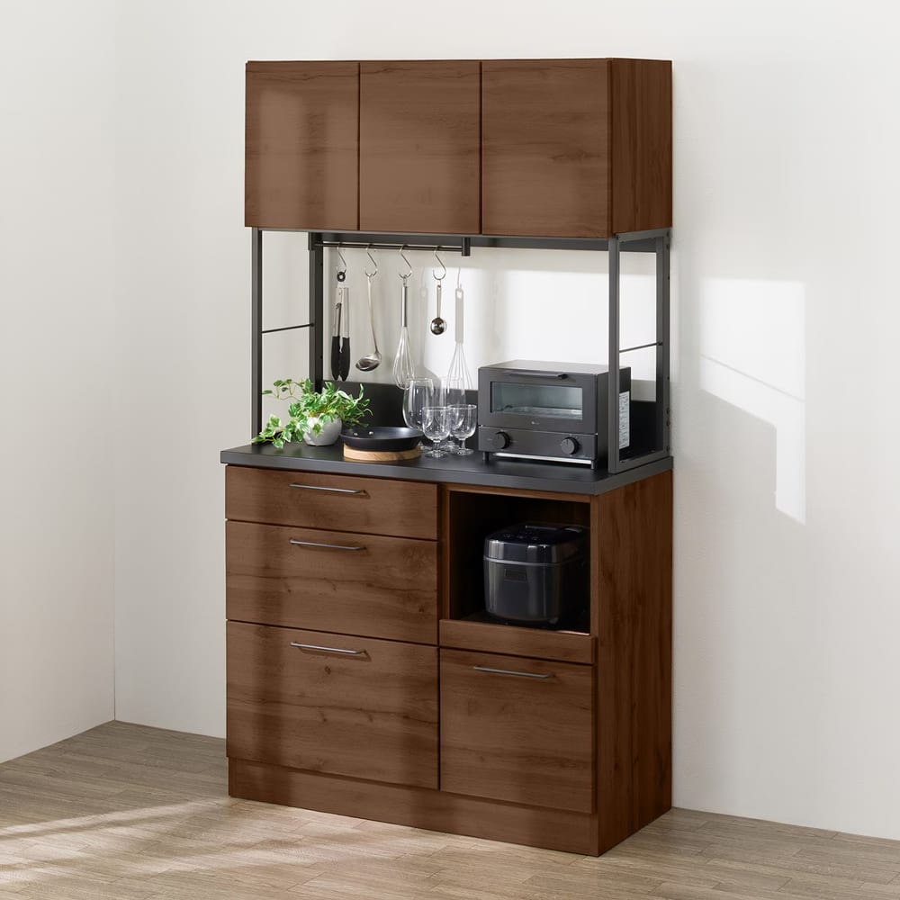 ◆木目とブラックカラーを組み合わせた、モダンなデザインのキッチンボードです。ヴィンテージ風やカフェ風など、お好みに合わせて自由にコーディネートできるのが魅力です。◆高さを抑えたコンパクトタイプで、上台収納にも手が届きやすい仕様です。