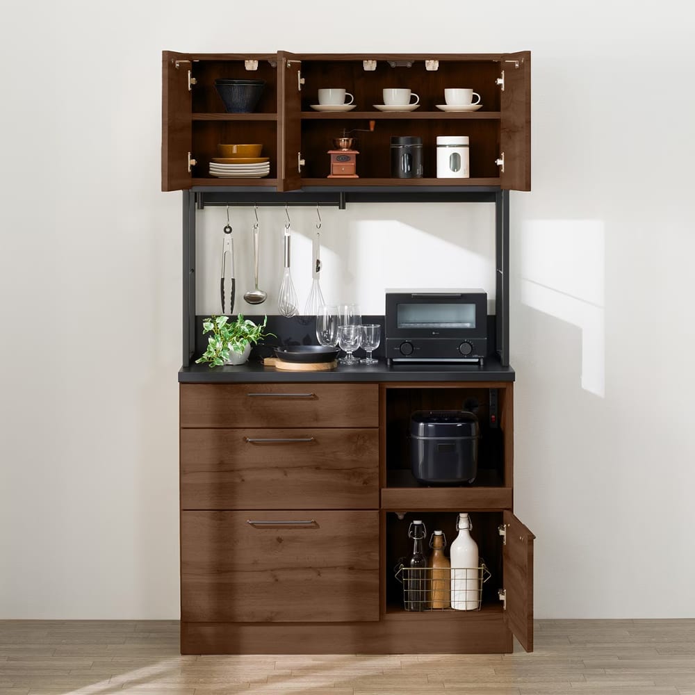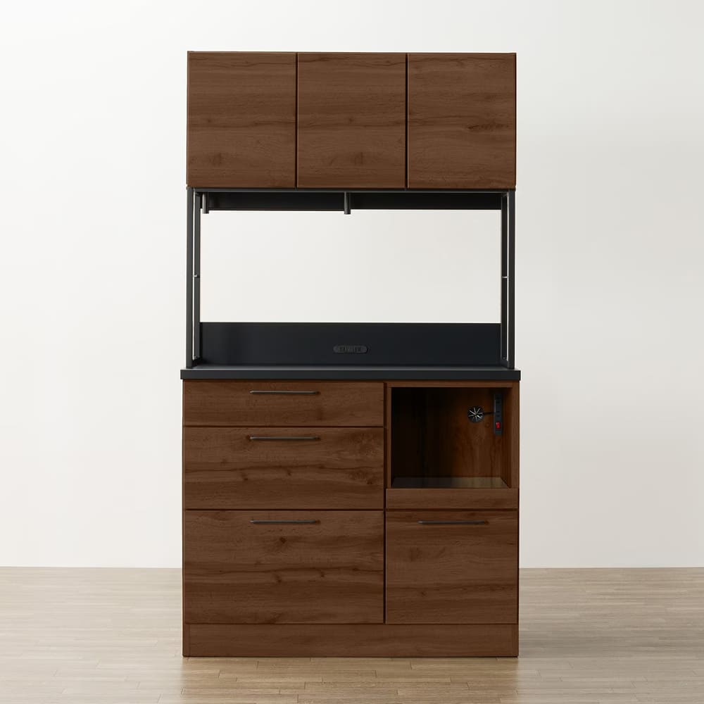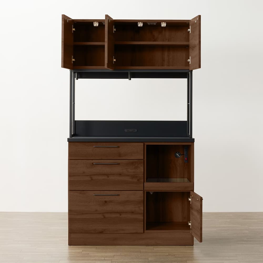 ◆また、下段は炊飯器など蒸気の出る調理家電の設置に便利なスライドテーブル式を採用。コンセントは中段部分に2口、さらに下段のオープンスペースにも付いているので、電子レンジやトースター、炊飯器や電気ポットなど複数の家電を同時に使いやすく、配線もすっきりまとめることができます。使う場所の近くにコンセントがあることで、コードがごちゃつかず、見た目もきれいに整います。