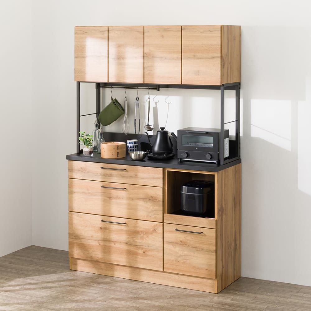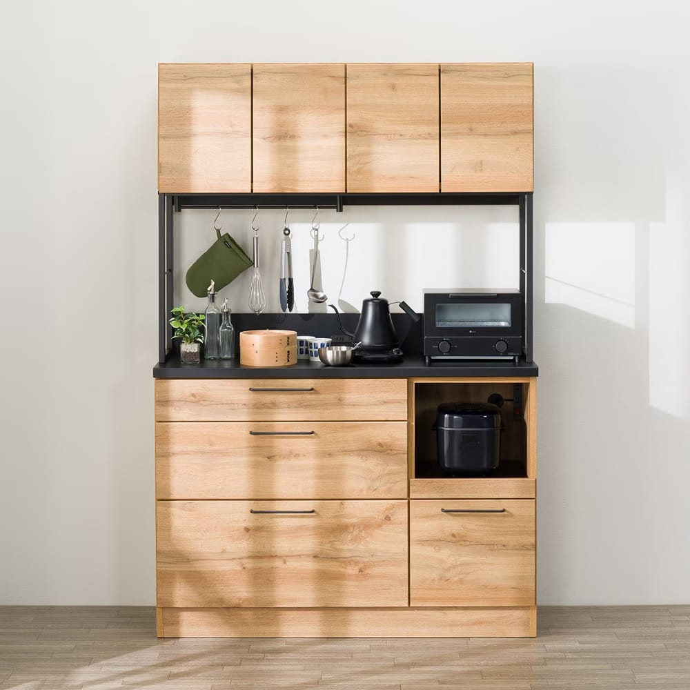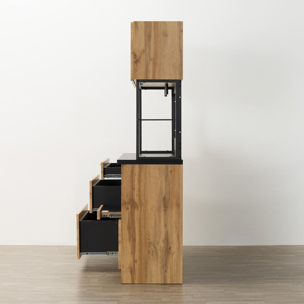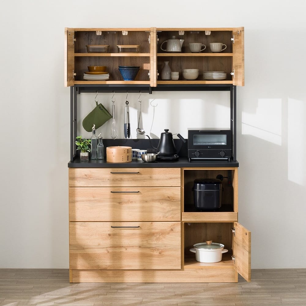 ◆木目とブラックカラーを組み合わせた、モダンなデザインのキッチンボードです。ヴィンテージ風やカフェ風など、お好みに合わせて自由にコーディネートできるのが魅力です。◆高さを抑えたコンパクトタイプで、上台収納にも手が届きやすい仕様です。