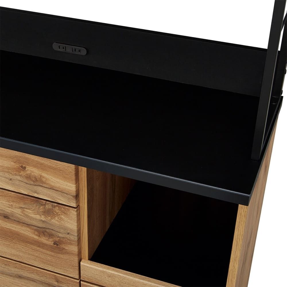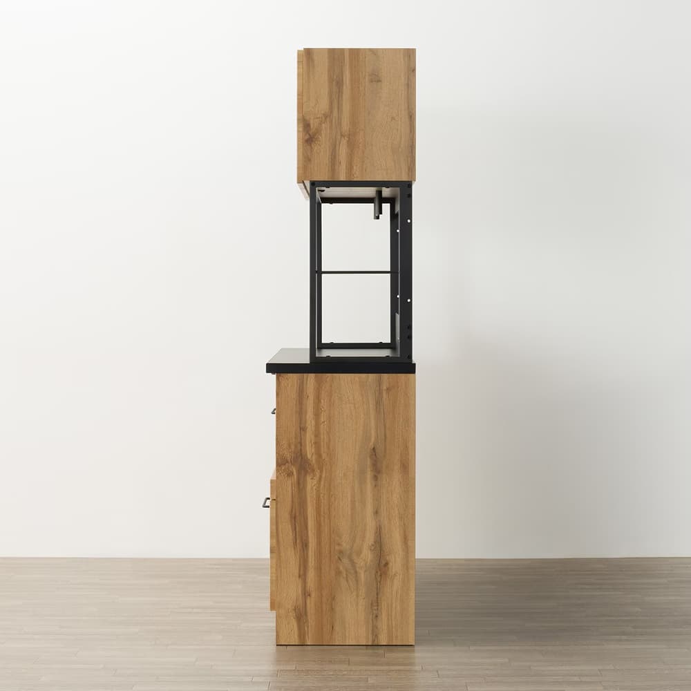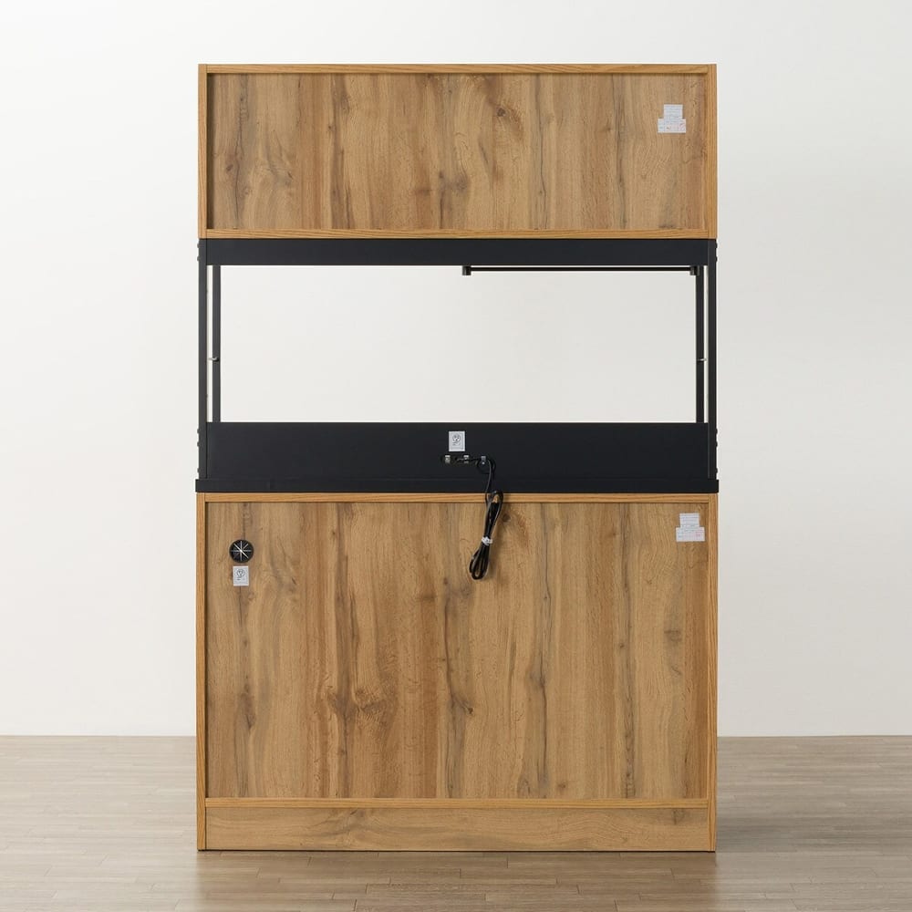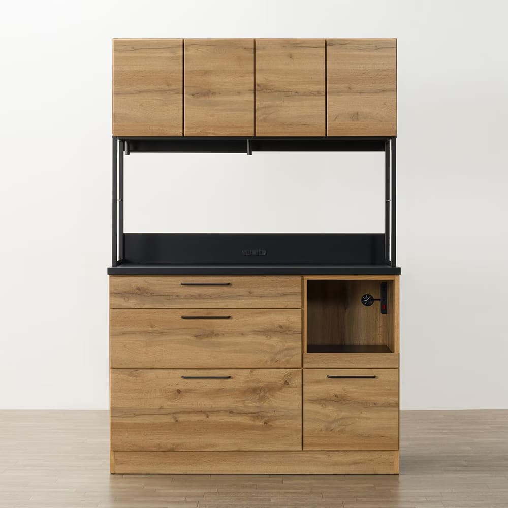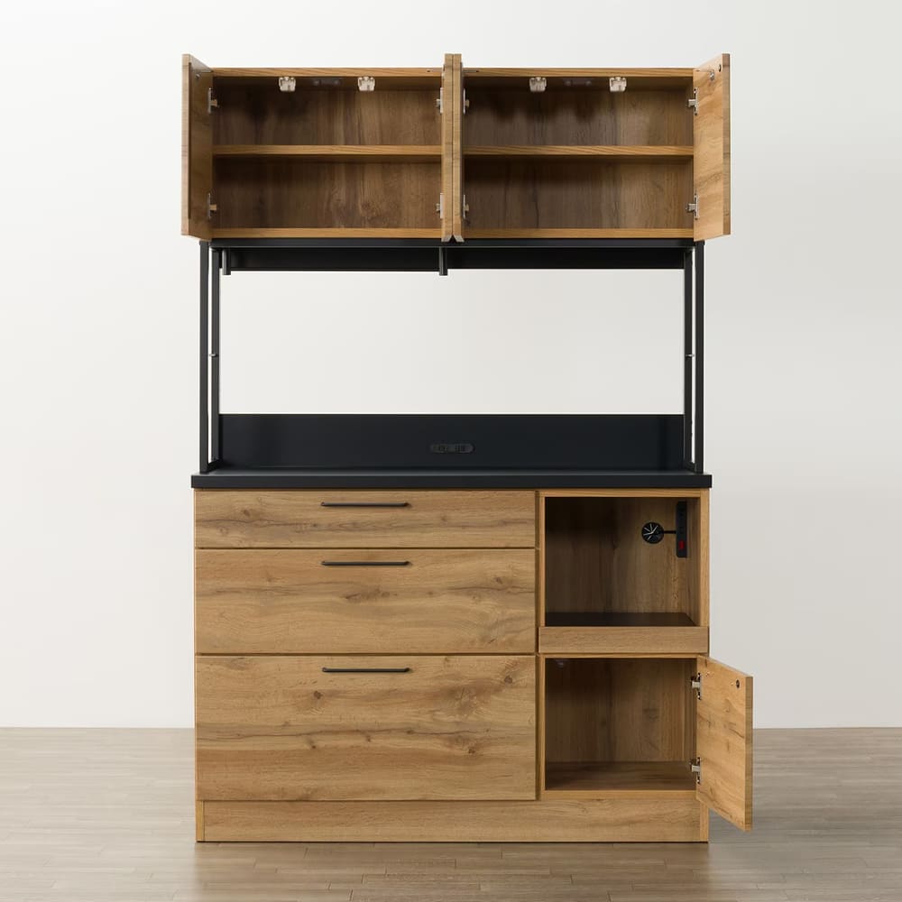 ◆また、下段は炊飯器など蒸気の出る調理家電の設置に便利なスライドテーブル式を採用。コンセントは中段部分に2口、さらに下段のオープンスペースにも付いているので、電子レンジやトースター、炊飯器や電気ポットなど複数の家電を同時に使いやすく、配線もすっきりまとめることができます。使う場所の近くにコンセントがあることで、コードがごちゃつかず、見た目もきれいに整います。