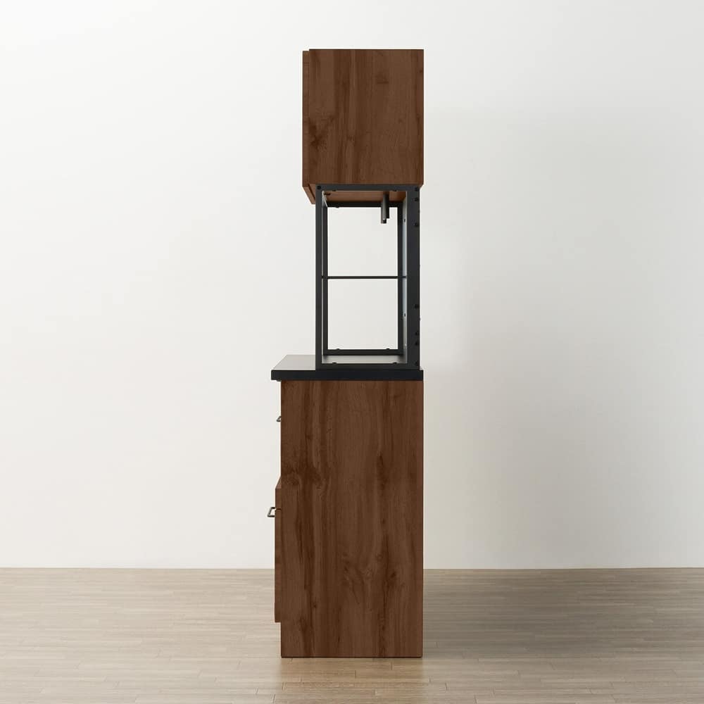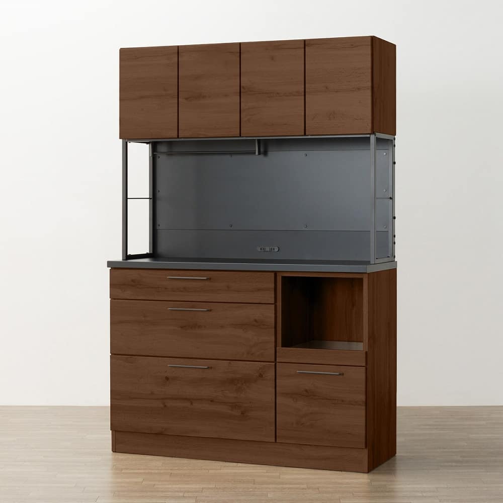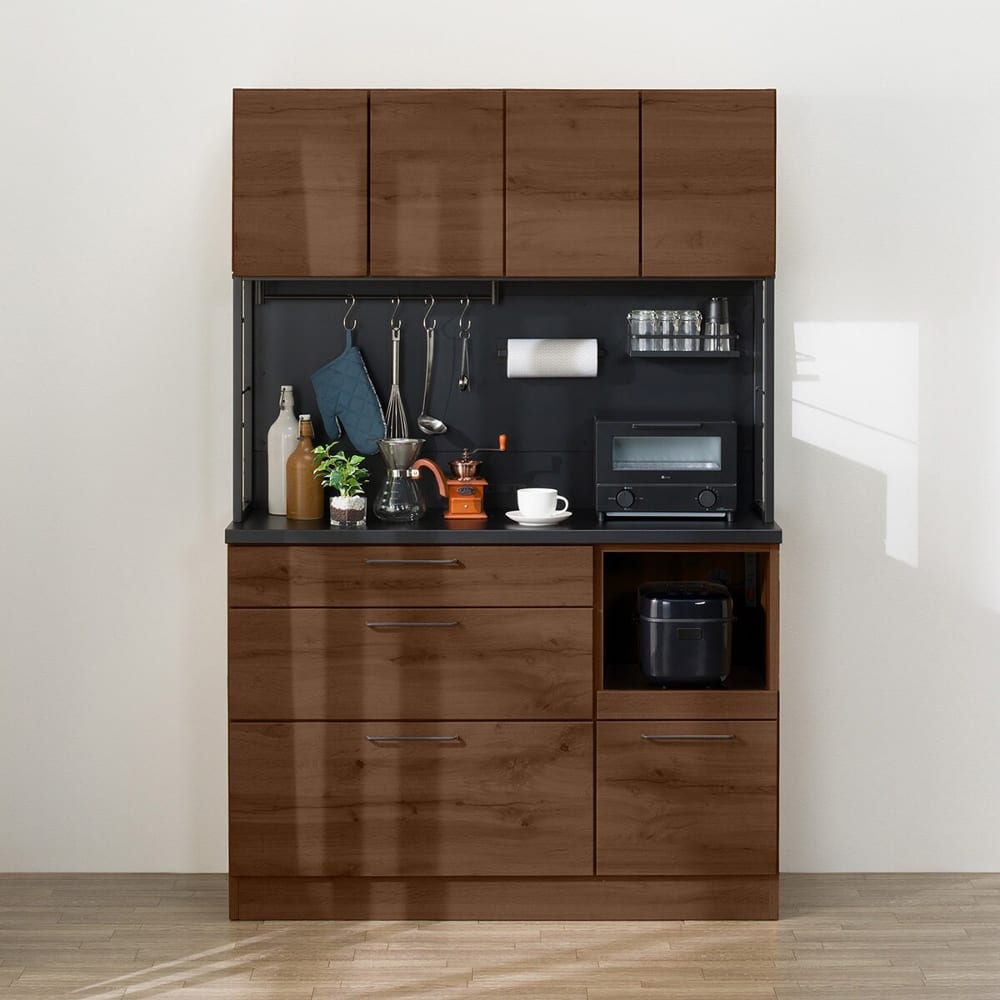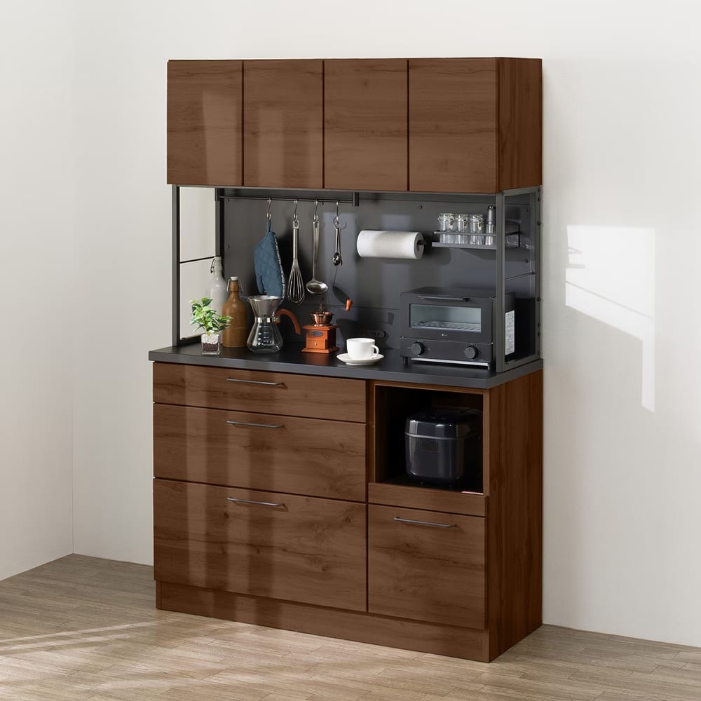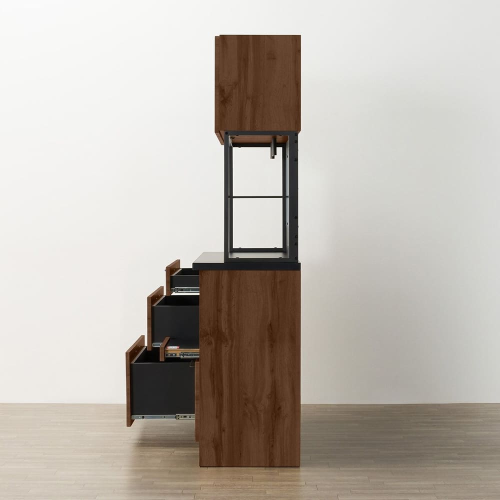 ◆木目とブラックカラーを組み合わせた、モダンなデザインのキッチンボードです。ヴィンテージ風やカフェ風など、お好みに合わせて自由にコーディネートできるのが魅力です。◆高さを抑えたコンパクトタイプで、上台収納にも手が届きやすい仕様です。