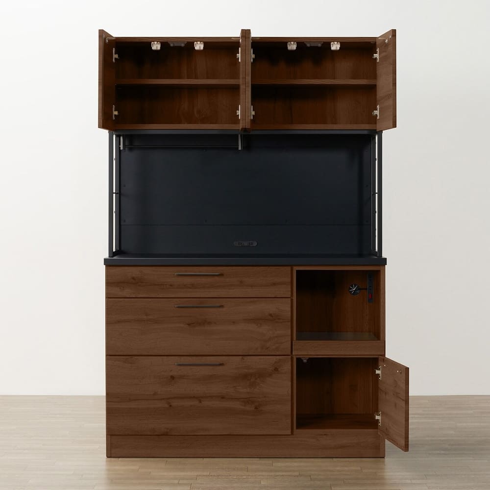 ◆また、下段は炊飯器など蒸気の出る調理家電の設置に便利なスライドテーブル式を採用。コンセントは中段部分に2口、さらに下段のオープンスペースにも付いているので、電子レンジやトースター、炊飯器や電気ポットなど複数の家電を同時に使いやすく、配線もすっきりまとめることができます。使う場所の近くにコンセントがあることで、コードがごちゃつかず、見た目もきれいに整います。