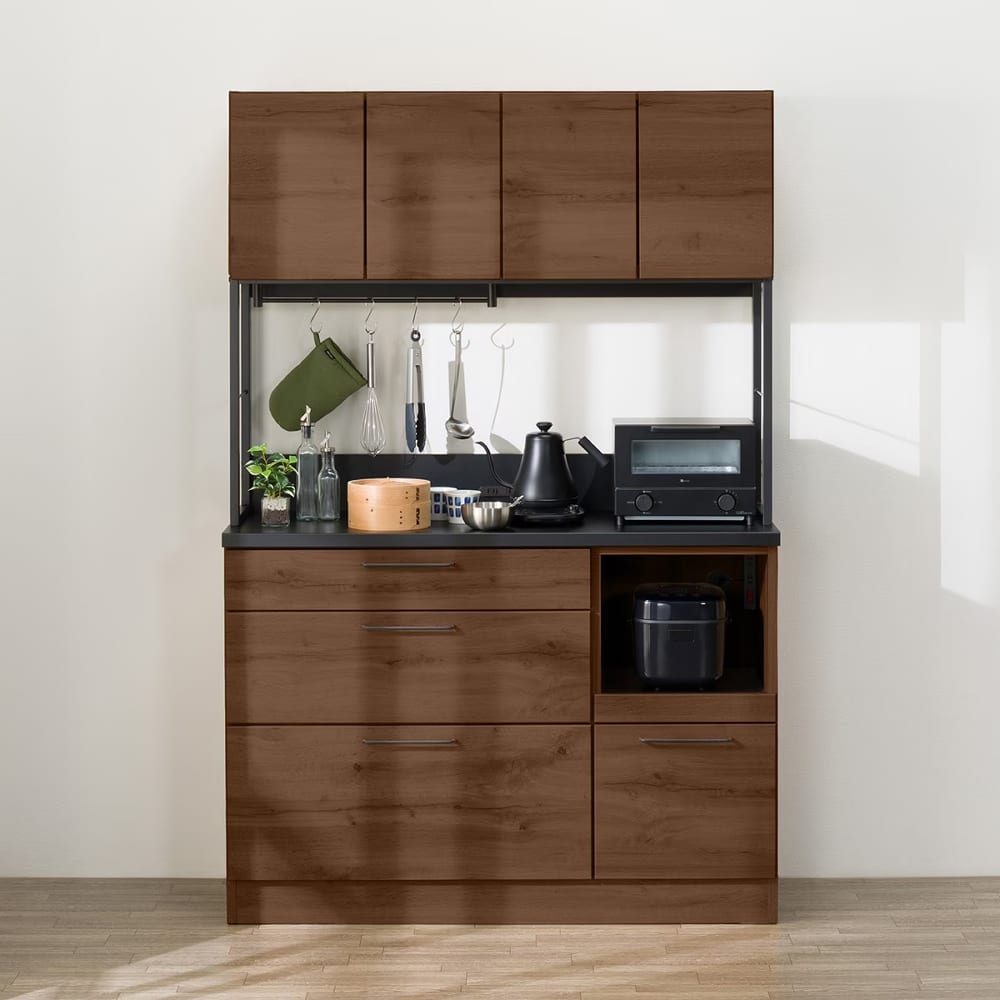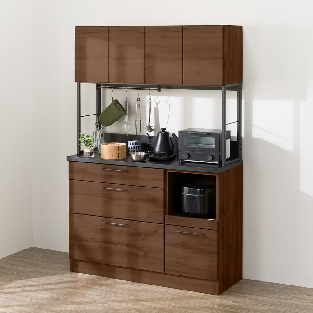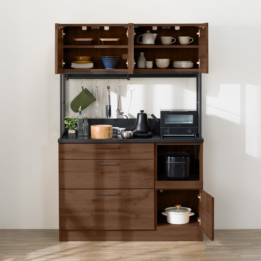 ◆木目とブラックカラーを組み合わせた、モダンなデザインのキッチンボードです。ヴィンテージ風やカフェ風など、お好みに合わせて自由にコーディネートできるのが魅力です。◆高さを抑えたコンパクトタイプで、上台収納にも手が届きやすい仕様です。