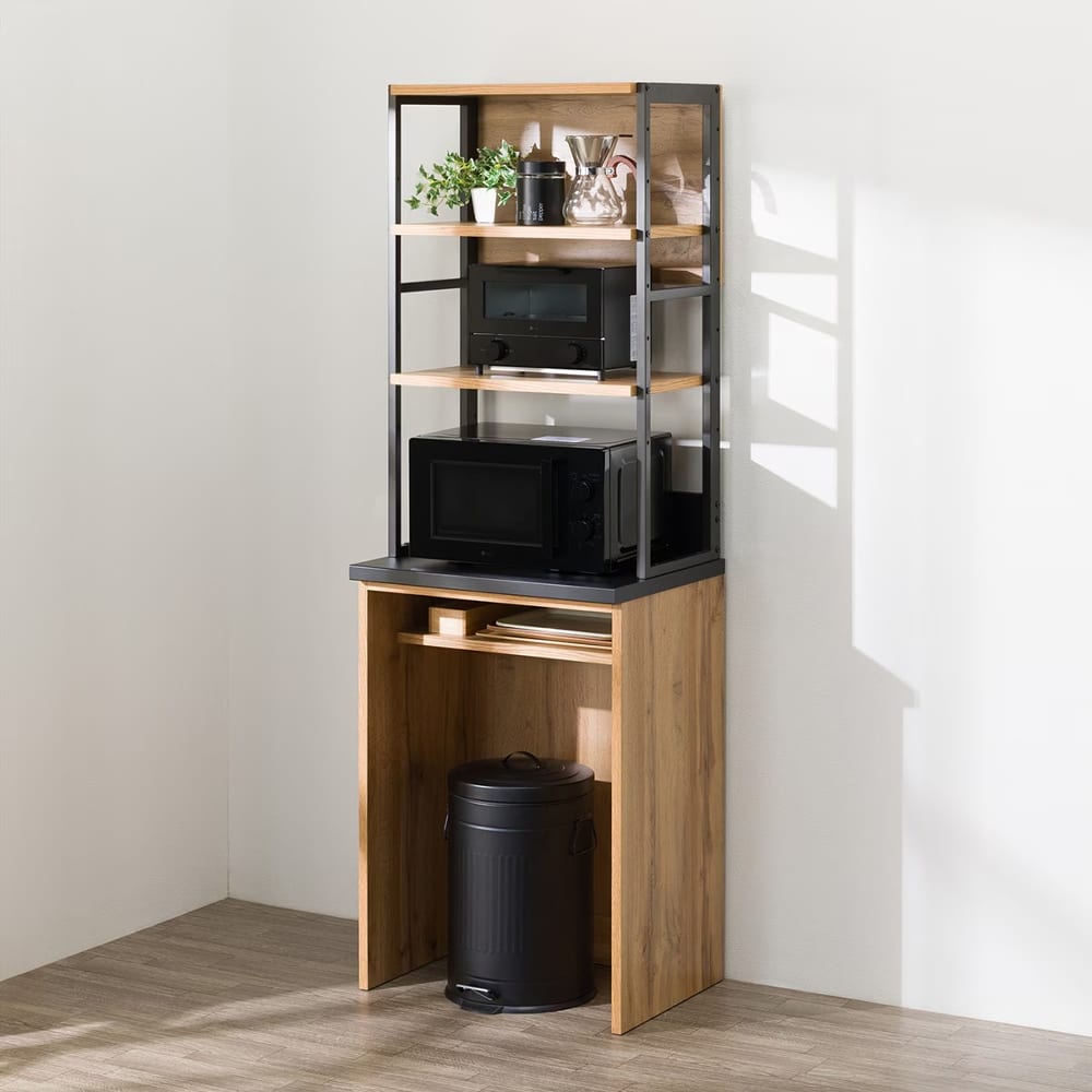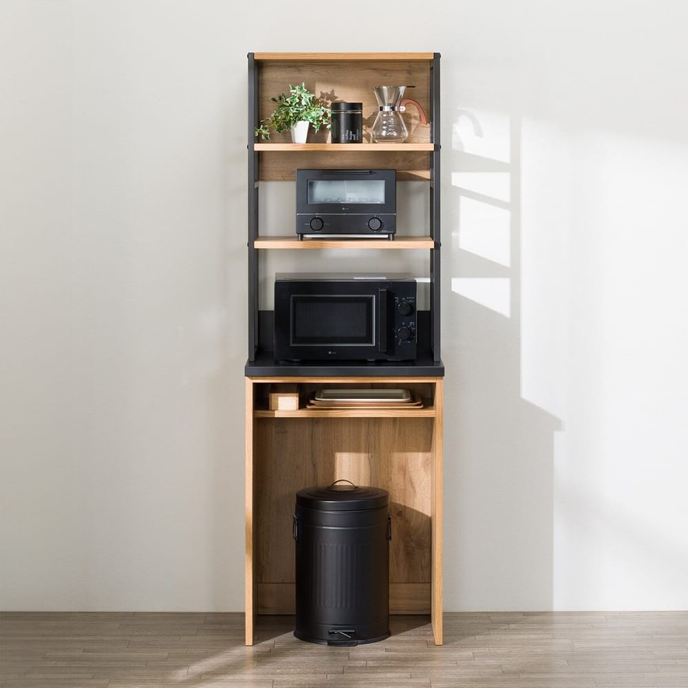 ◆上段には2段の棚が設けられており、調味料や食器を飾るように収納できる「魅せる収納」として活用できます。下段は広々としているので、ダストボックスを置いたり、お好みに合わせて自由にカスタマイズ可能です。