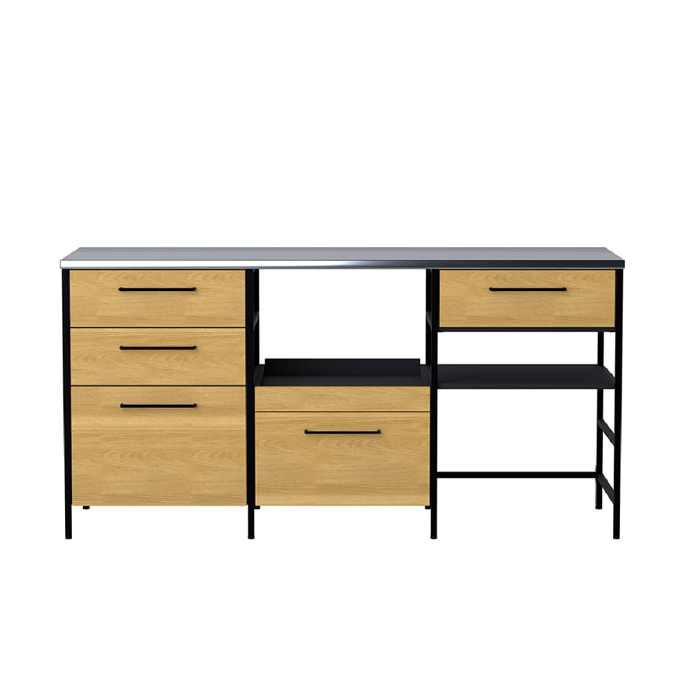 ◆オーク突板とステンレス天板・アイアン脚の異素材デザインのキッチンカウンターです。◆水や汚れに強いステンレス天板です。