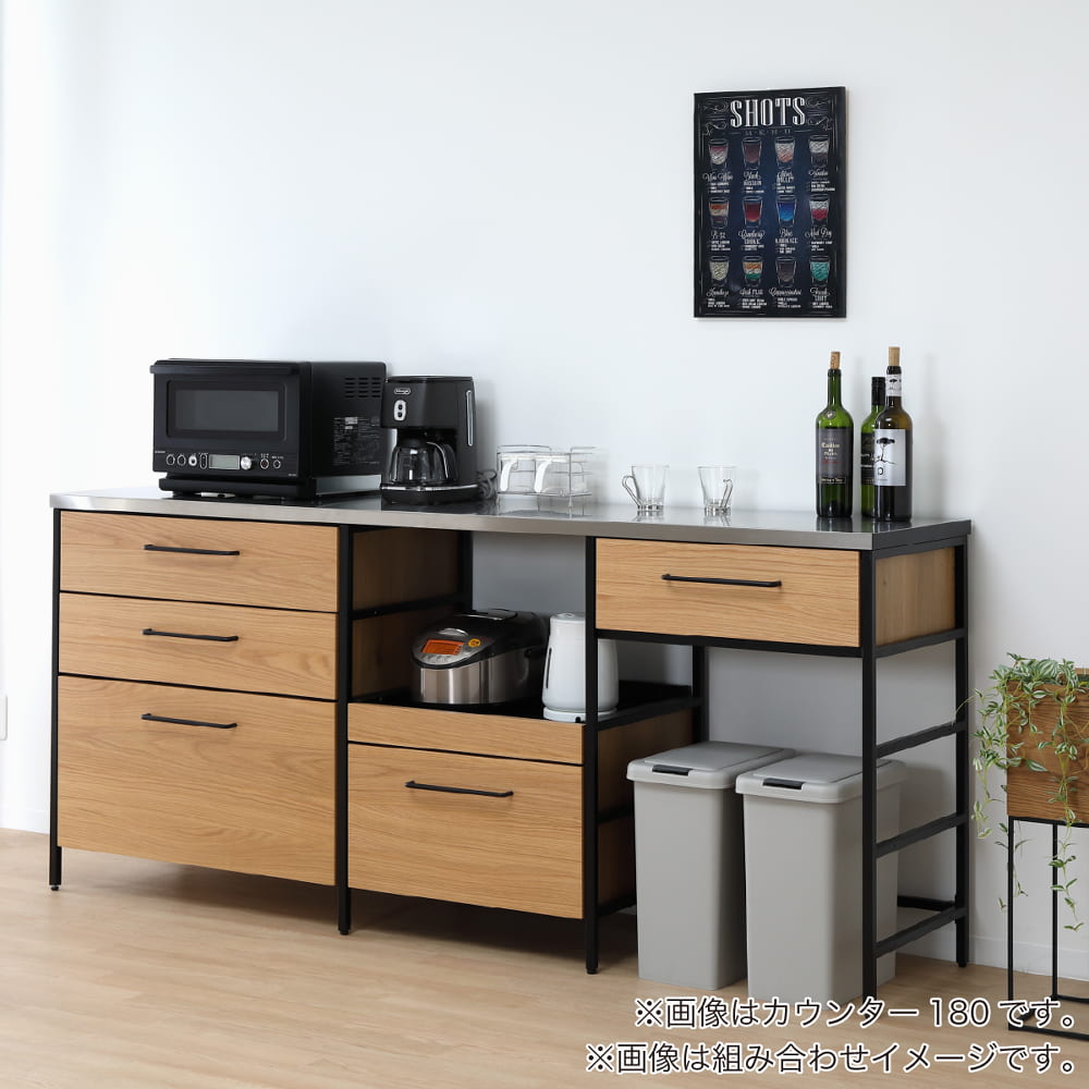 ◆オーク突板とステンレス天板・アイアン脚の異素材デザインのキッチンカウンターです。◆水や汚れに強いステンレス天板です。