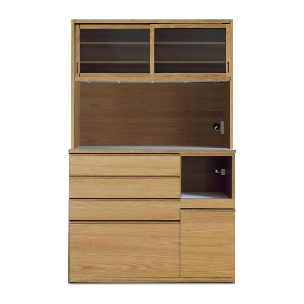 ◆天然木突板の質感の良い高級感がある食器棚です。◆キッチンボードのオープン部にはモイスを使用しており、蒸気を吸湿・放出、耐火・消臭・防カビなどの効果があります。