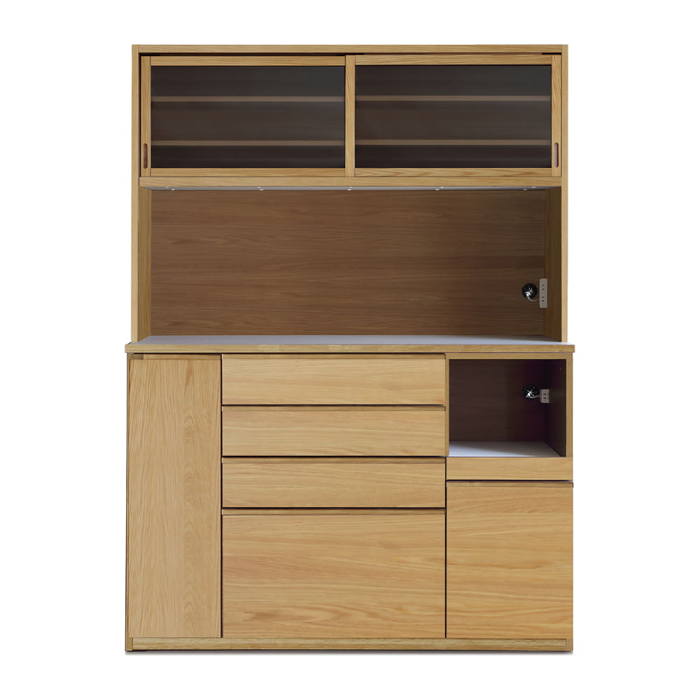 ◆天然木突板の質感の良い高級感がある食器棚です。◆キッチンボードのオープン部にはモイスを使用しており、蒸気を吸湿・放出、耐火・消臭・防カビなどの効果があります。
