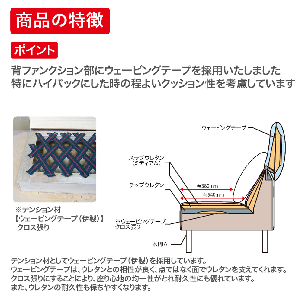◆座面の前側は硬めの座り心地で、食事時の姿勢をサポートします。