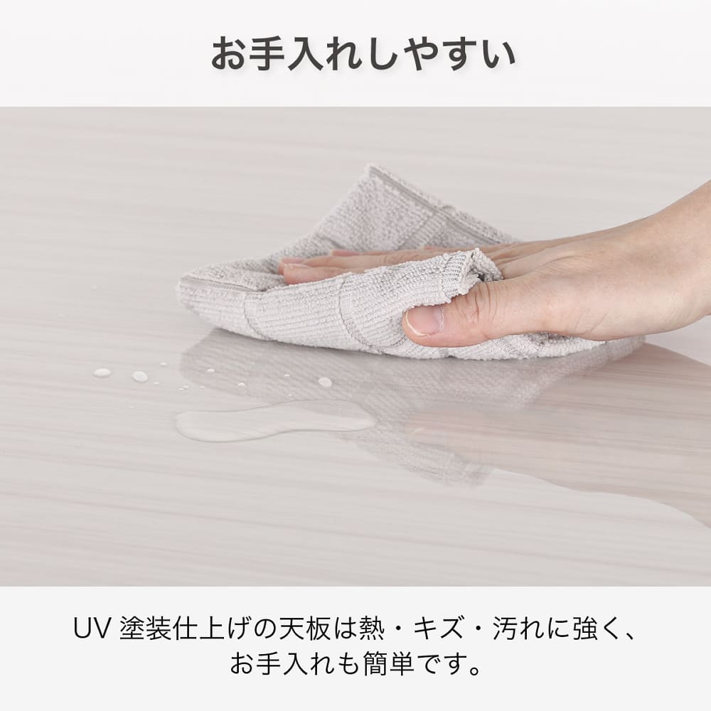 UV塗装仕上げの天板は熱や傷に強く、お手入れも簡単。