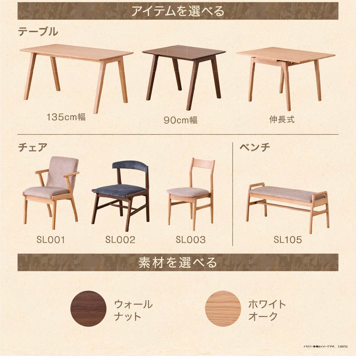 テーブルと同じデザインのチェアやベンチを組み合わせて選べます。