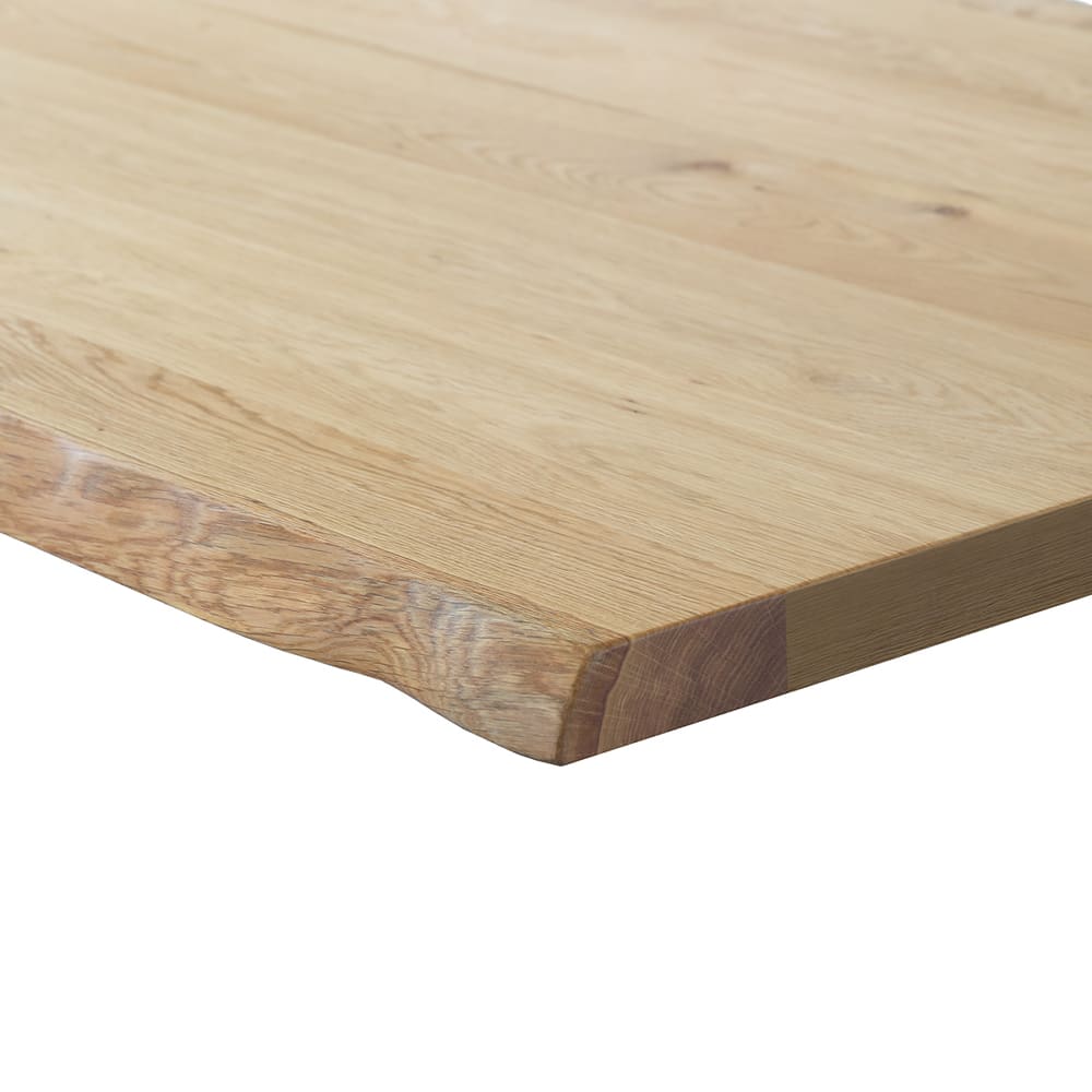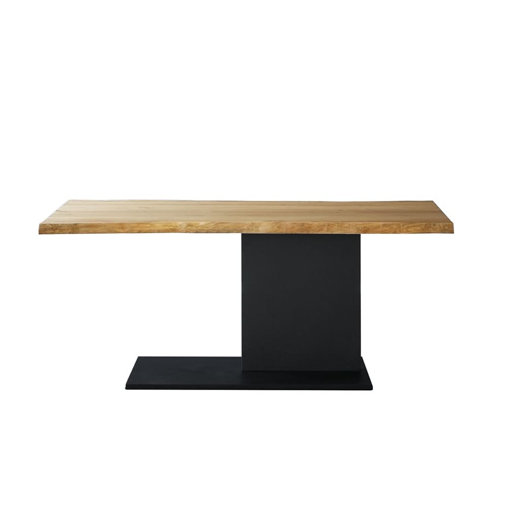 ◆天板両側面は天然杢ノタ面を使用しており、1枚1枚形状が違い、一枚板のような風合いのテーブルです◆テーブル脚は薄い板状になっており足下がすっきり広く使えます