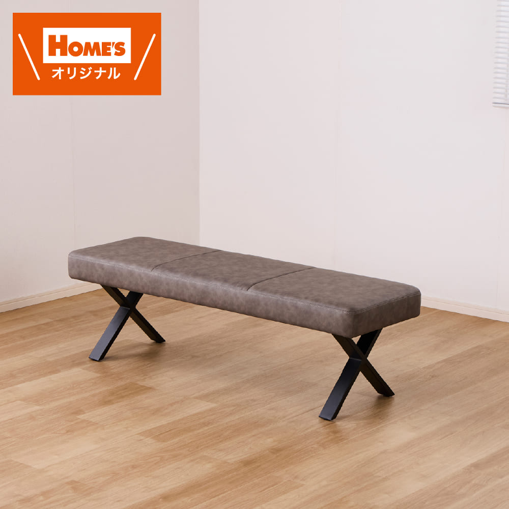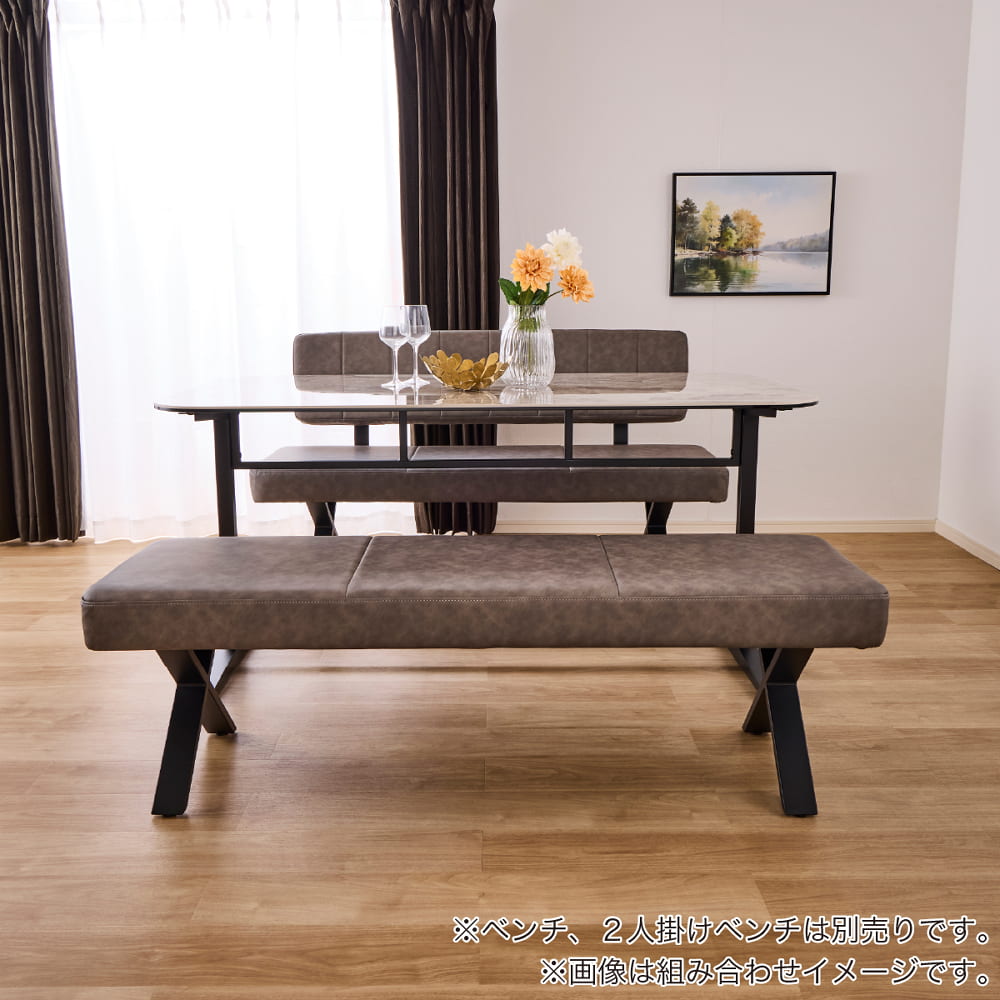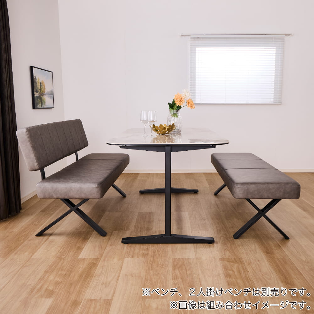 ◆横幅の広いベンチなので食事後にリラックスできる。◆座面には汚れてもサッと拭ける合成皮革を使用。