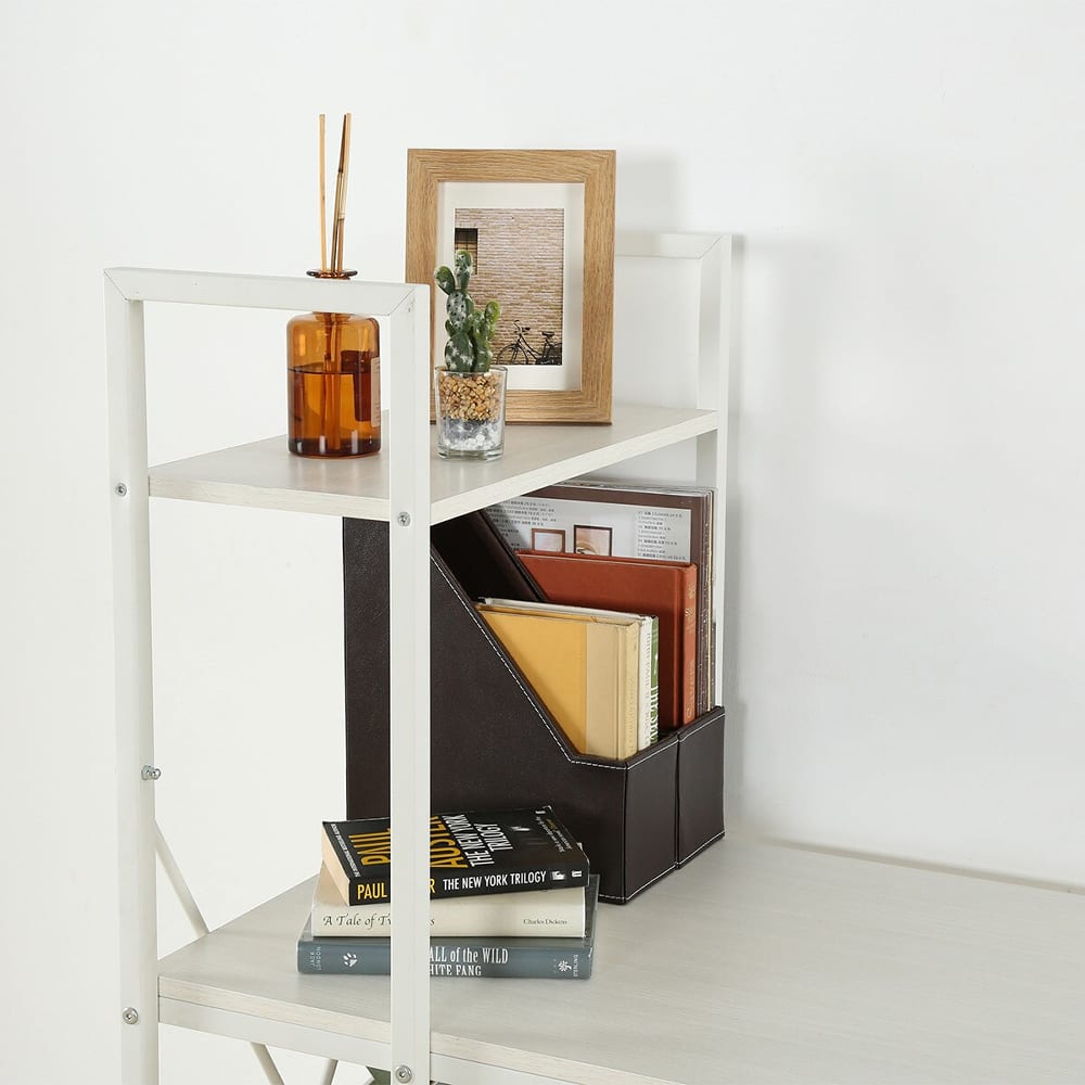 ◆シンプルで使いやすいデザインのシステムデスクは、コンパクトながらも収納力抜群。◆左右どちらにも組み替え可能なシェルフは、お部屋のレイアウトに合わせて自由に配置できるため、スペースを有効活用できます。