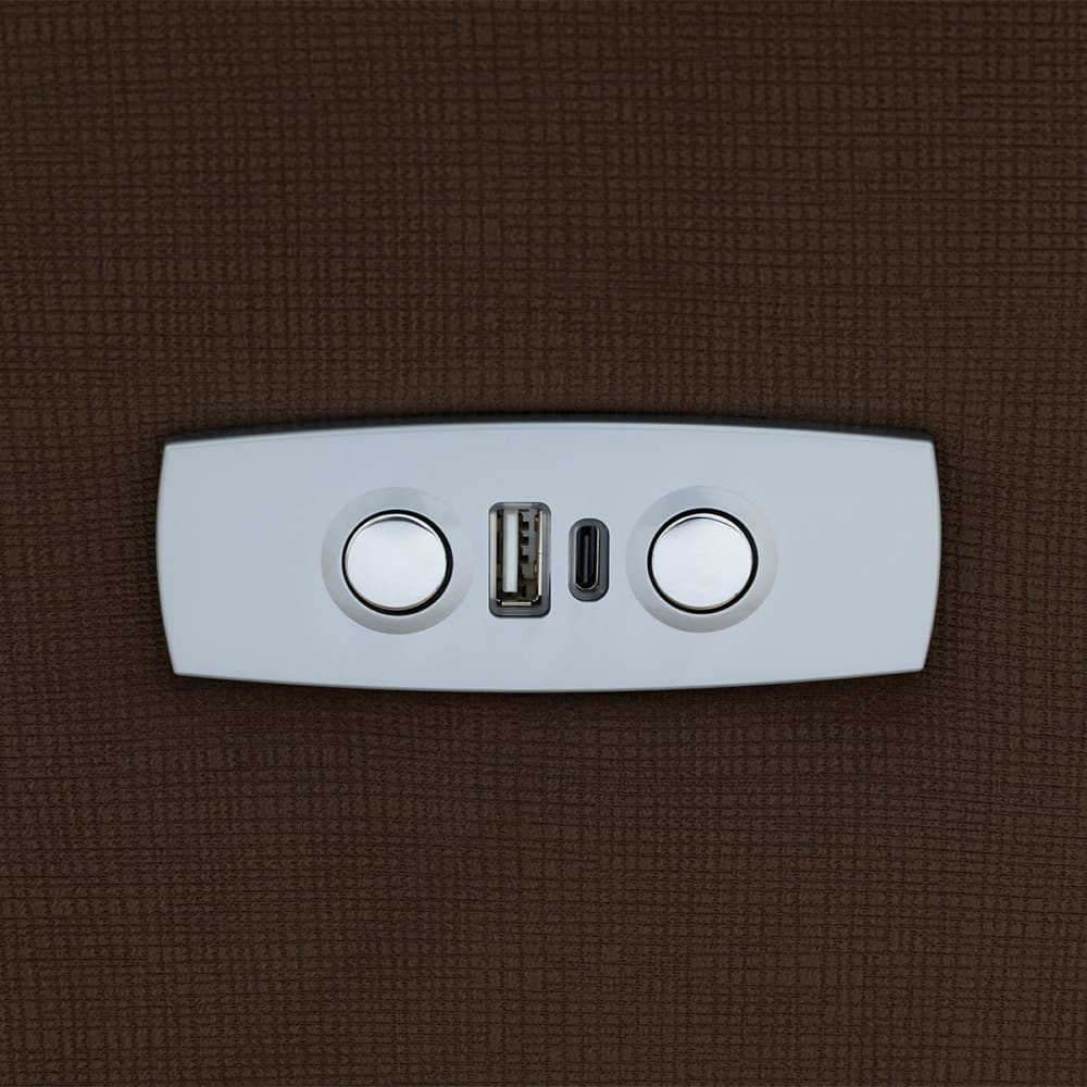 ◆リクライニング操作は、側面の埋込み式ボタンで行え、コードやリモコンがないので見た目もスッキリ。また、スイッチ部分にはUSBポート付きなので、スマートフォンなどを充電しながらくつろげます。