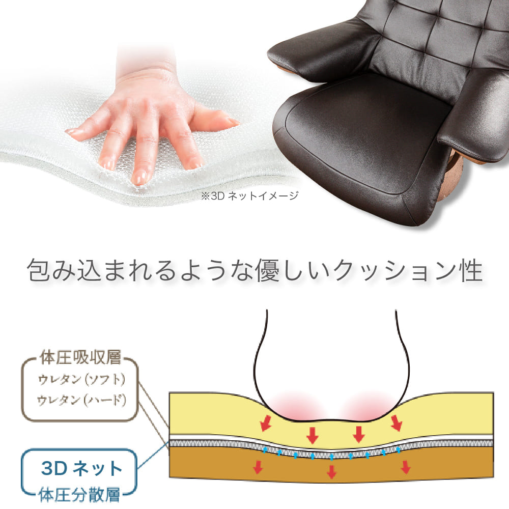 ◆体圧吸収層と体圧分散層を組み合わせたクッション構造で、局部への負荷を軽減し、包み込まれるような優しい座り心地を実現しました。
