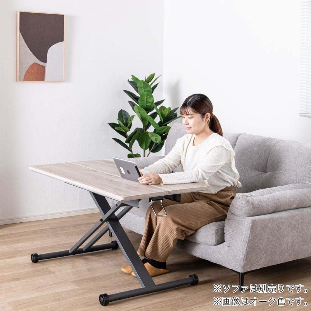◆中央溝はスマホ・タブレットスタンドや配線落としに便利。昇降機能は無段階式