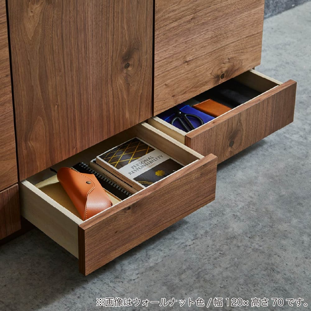 ◆下部の引き出しは高さ85cmサイズの場合はフルオープンレール仕様で、高さ70cmの場合はレール無し。