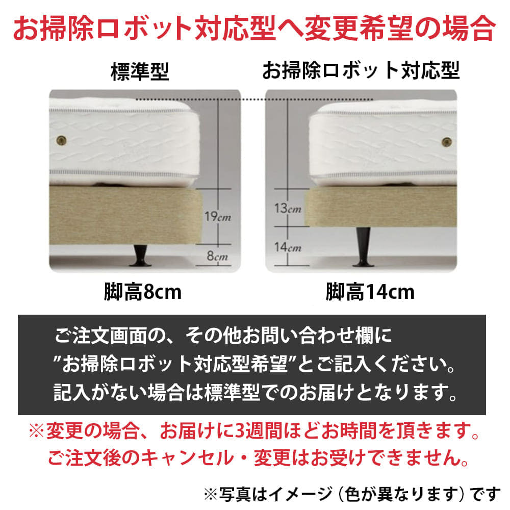 ご注文画面の、その他お問い合わせ欄に“お掃除ロボット対応型希望”とご記入ください。記入がない場合は標準型(ボトム:19cm、脚高:8cm)でのお届けとなります。