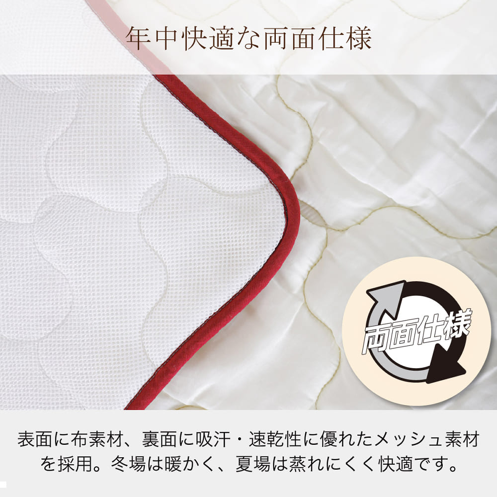 ◆特殊中空ポリエステル綿『フィルケアポリティ』を使用し、従来品に比べ通気性やクッション性を高めました。フィルケアは三つの穴が開いた中空構造。へたりにくく嵩高回復性に優れている。また、繊維を螺旋状にした『スパイラル構造』により、スプリングに似た弾性があり、羽毛タッチで優れた断熱性・発散性を備え、《抗菌・防臭加工》を施している。