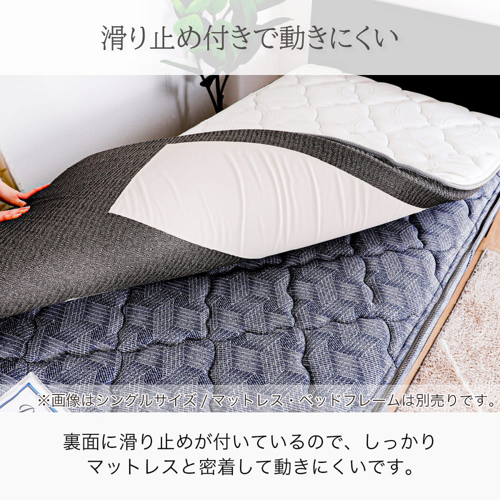 《どんなマットレスでもユーロトップのような寝心地へランクアップしてくれます》◆裏面には滑り止めが付いているため、四隅にゴムをかける必要はありません。