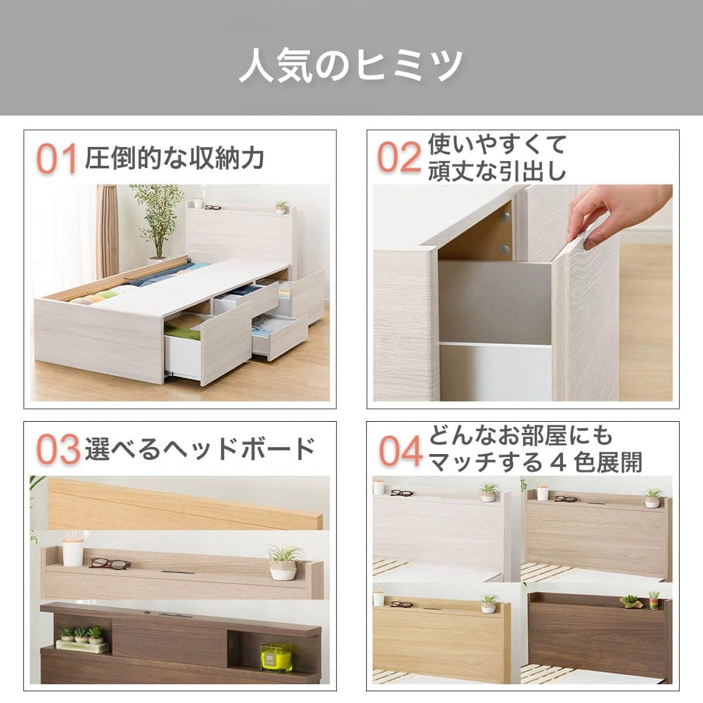 ◆ベッド下のデッドスペースを有効活用。大小の引出しで分類収納、ヘッドボードにも便利な収納・コンセント付き。◆大きさの異なる引出しを使い分けることで、衣類、小物、季節用品などを効率的に整理できます。