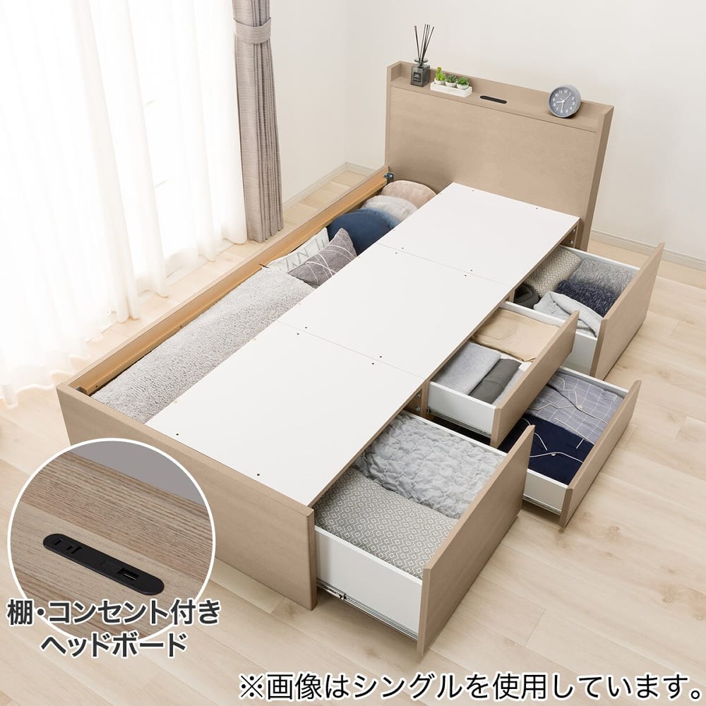 ◆ベッド下のデッドスペースを有効活用。大小の引出しで分類収納、ヘッドボードにも便利な収納・コンセント付き。◆大きさの異なる引出しを使い分けることで、衣類、小物、季節用品などを効率的に整理できます。
