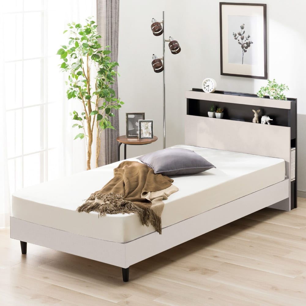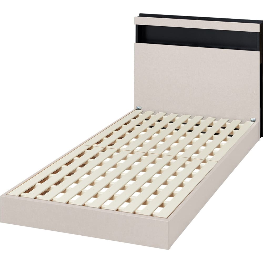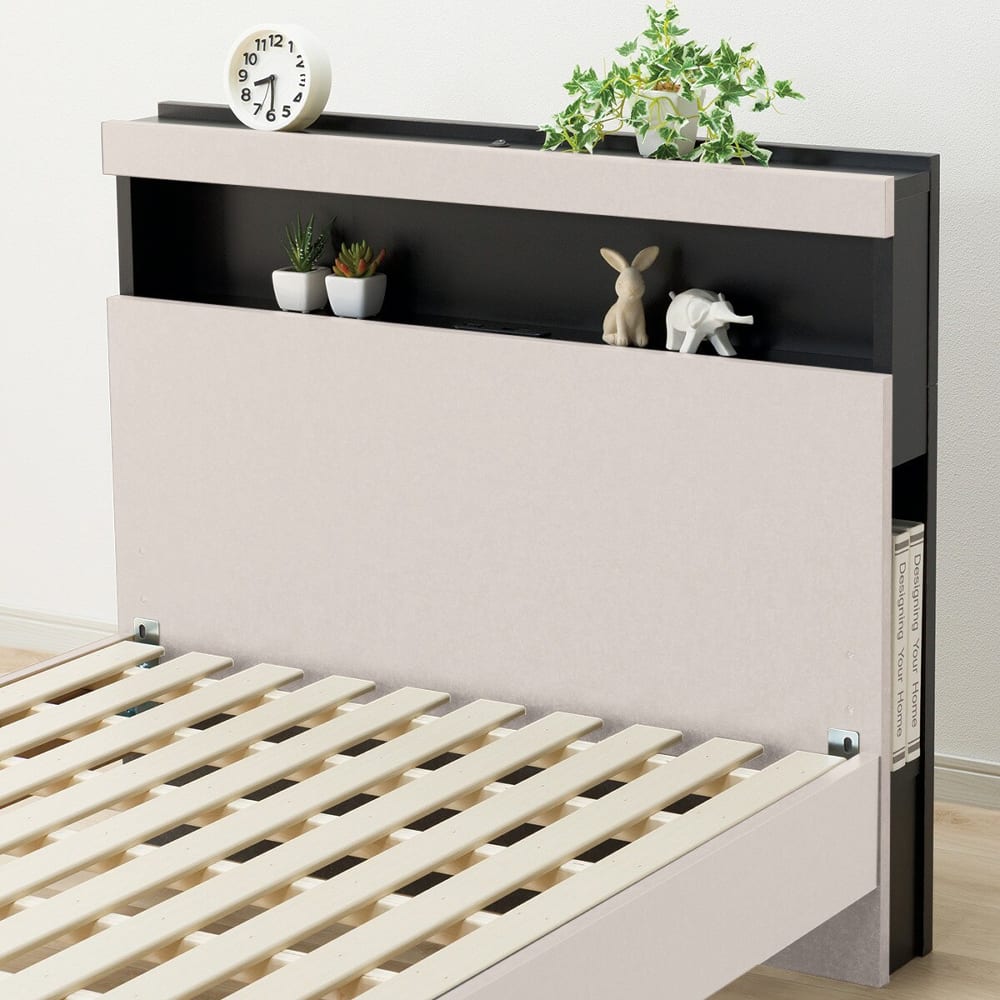◆2トーンがモダンな印象の機能付きベッドフレーム。◆ヘッドボードの棚には枕元をやさしく照らしてくれるLED照明が設置されているので、暗いお部屋でも安心です。