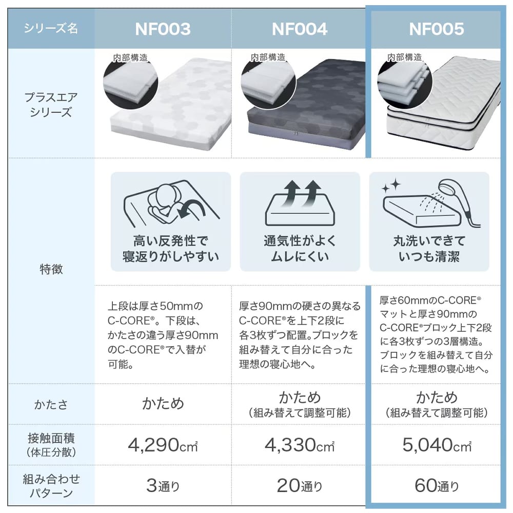 ◆弾力性のあるファイバー素材「C-CORE」を使用し、マットと3段階のかたさが選べるC-COREブロックを組み合わせることで、ワンランク上の寝心地と優れた耐久性を実現しています。◆ファイバー素材は空気を包み込むように絡み合い、3次元ファイバースプリング構造体を形成。これにより、体圧分散性や通気性に優れ、今までにない快適な睡眠環境を提供します。