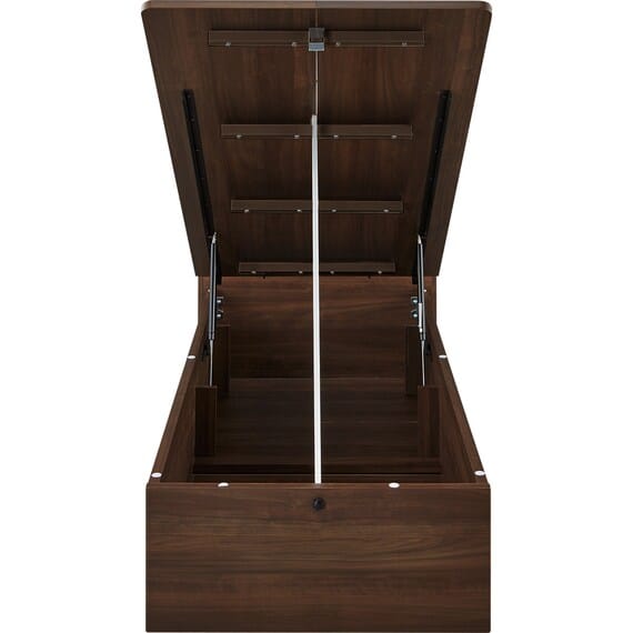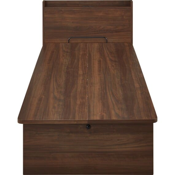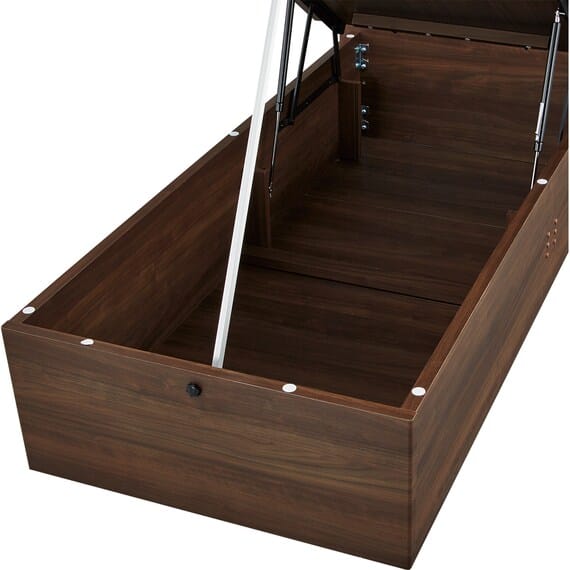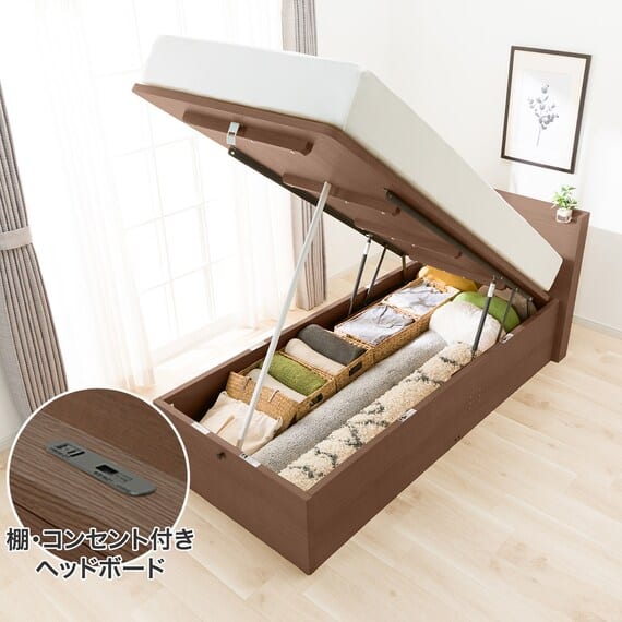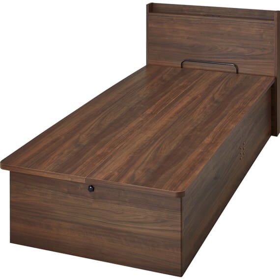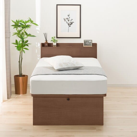【N-ジオ】シリーズは、横開きと縦開きのタイプがあり、引出しに入らない大きなサイズの物も収納できるうえ、中身を一度に見渡せる大容量収納が魅力です。さらに、ヘッドボードを選べるため、お部屋の雰囲気やライフスタイルに合わせて自分好みのデザインを選びたい方におすすめです。シリンダーで跳ね上げをサポート。マットレスを載せたままラクラク開閉が可能です。
