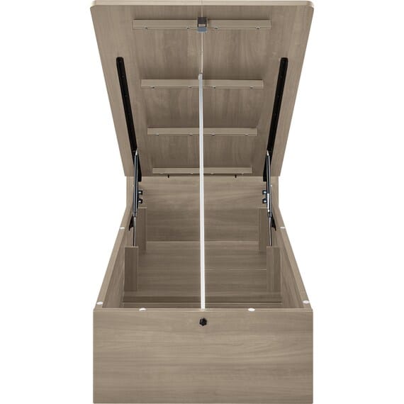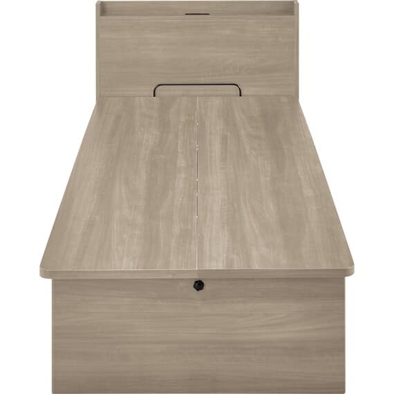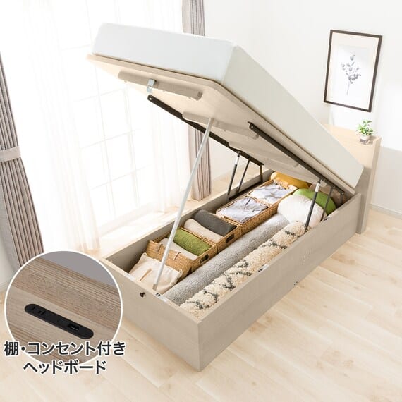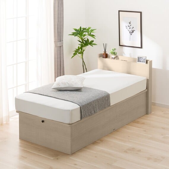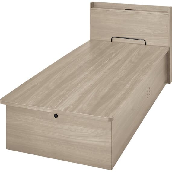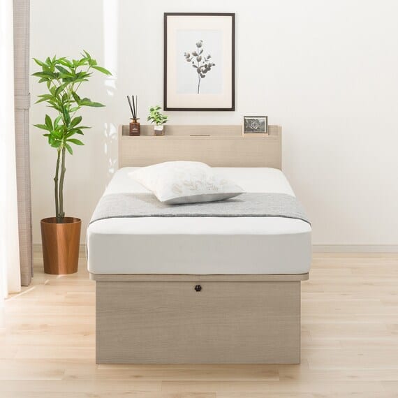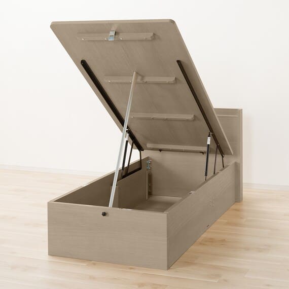 【N-ジオ】シリーズは、横開きと縦開きのタイプがあり、引出しに入らない大きなサイズの物も収納できるうえ、中身を一度に見渡せる大容量収納が魅力です。さらに、ヘッドボードを選べるため、お部屋の雰囲気やライフスタイルに合わせて自分好みのデザインを選びたい方におすすめです。シリンダーで跳ね上げをサポート。マットレスを載せたままラクラク開閉が可能です。
