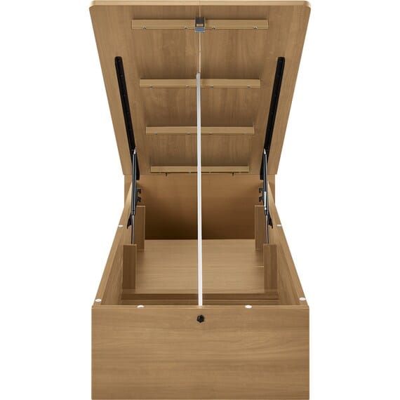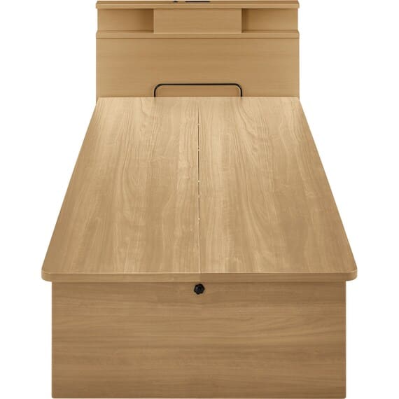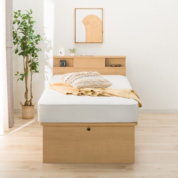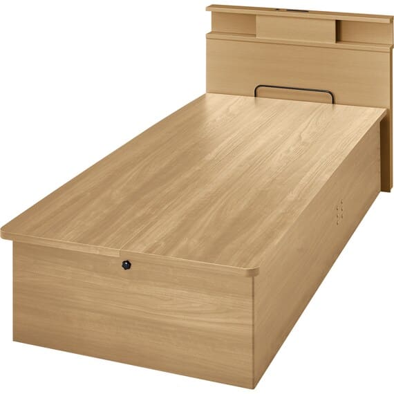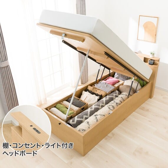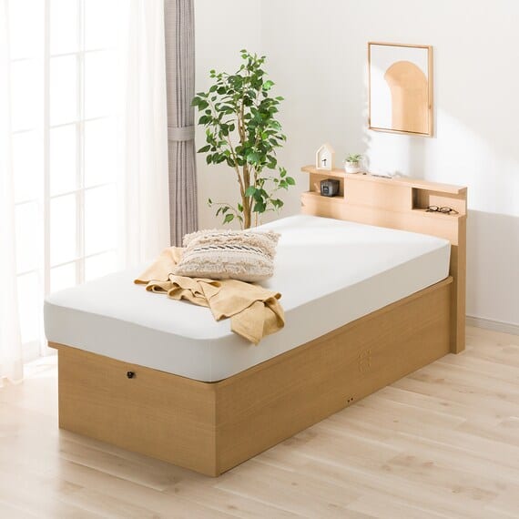 【N-ジオ】シリーズは、横開きと縦開きのタイプがあり、引出しに入らない大きなサイズの物も収納できるうえ、中身を一度に見渡せる大容量収納が魅力です。さらに、ヘッドボードを選べるため、お部屋の雰囲気やライフスタイルに合わせて自分好みのデザインを選びたい方におすすめです。シリンダーで跳ね上げをサポート。マットレスを載せたままラクラク開閉が可能です。