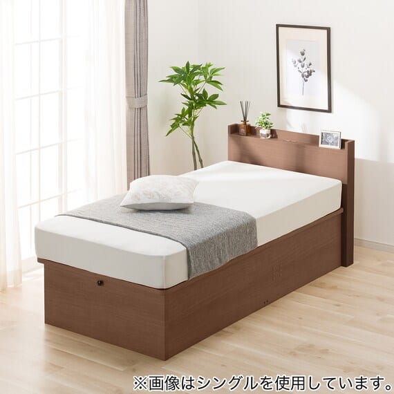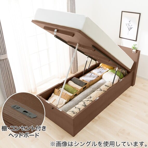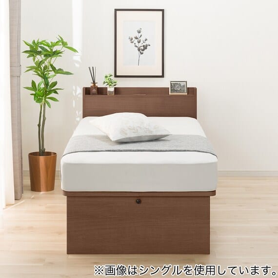 【N-ジオ】シリーズは、横開きと縦開きのタイプがあり、引出しに入らない大きなサイズの物も収納できるうえ、中身を一度に見渡せる大容量収納が魅力です。さらに、ヘッドボードを選べるため、お部屋の雰囲気やライフスタイルに合わせて自分好みのデザインを選びたい方におすすめです。シリンダーで跳ね上げをサポート。マットレスを載せたままラクラク開閉が可能です。