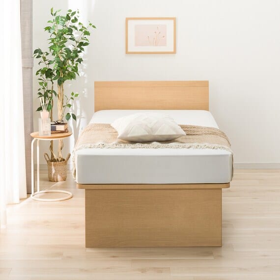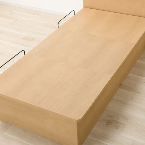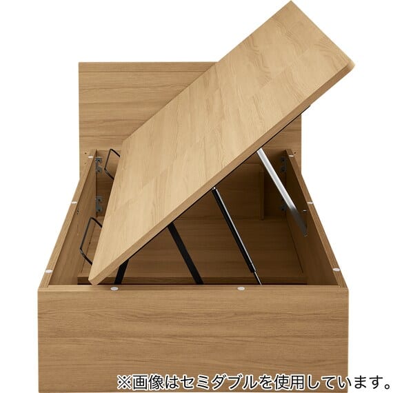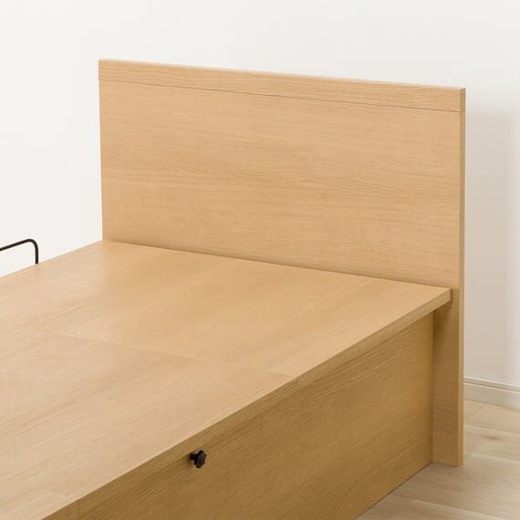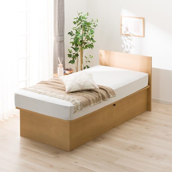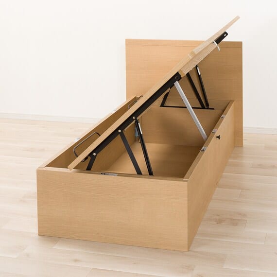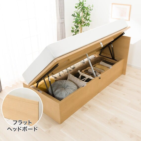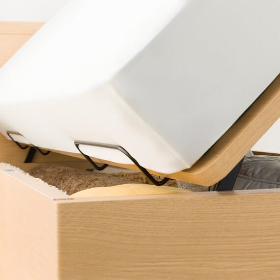 【N-ジオ】シリーズは、横開きと縦開きのタイプがあり、引出しに入らない大きなサイズの物も収納できるうえ、中身を一度に見渡せる大容量収納が魅力です。さらに、ヘッドボードを選べるため、お部屋の雰囲気やライフスタイルに合わせて自分好みのデザインを選びたい方におすすめです。シリンダーで跳ね上げをサポート。マットレスを載せたままラクラク開閉が可能です。