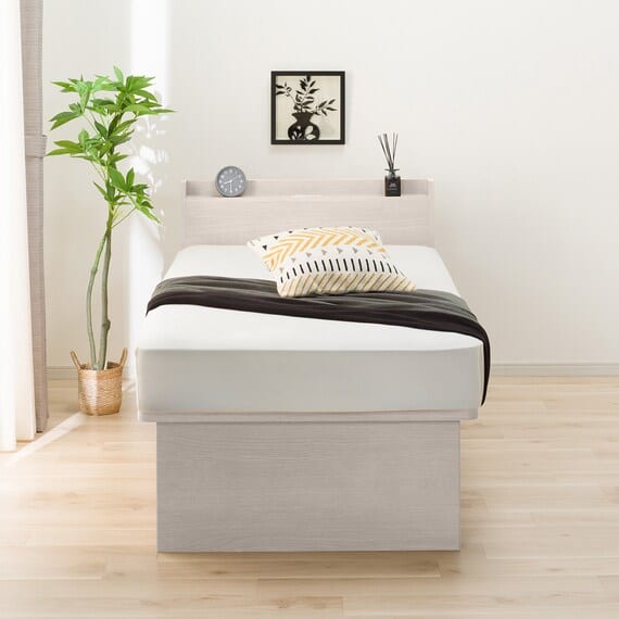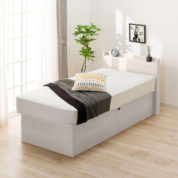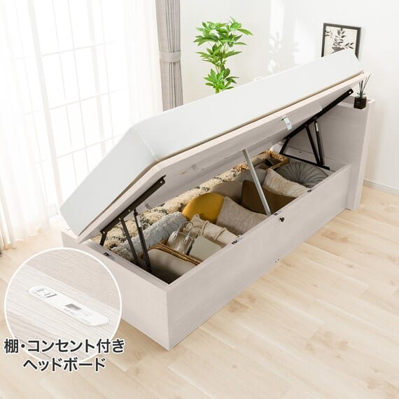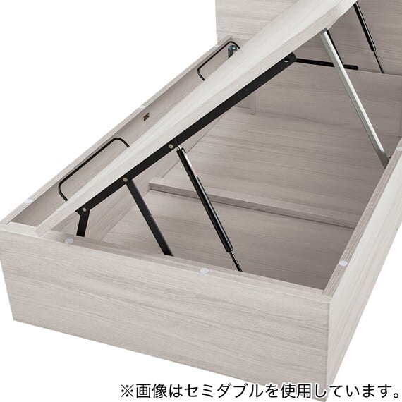 【N-ジオ】シリーズは、横開きと縦開きのタイプがあり、引出しに入らない大きなサイズの物も収納できるうえ、中身を一度に見渡せる大容量収納が魅力です。さらに、ヘッドボードを選べるため、お部屋の雰囲気やライフスタイルに合わせて自分好みのデザインを選びたい方におすすめです。シリンダーで跳ね上げをサポート。マットレスを載せたままラクラク開閉が可能です。