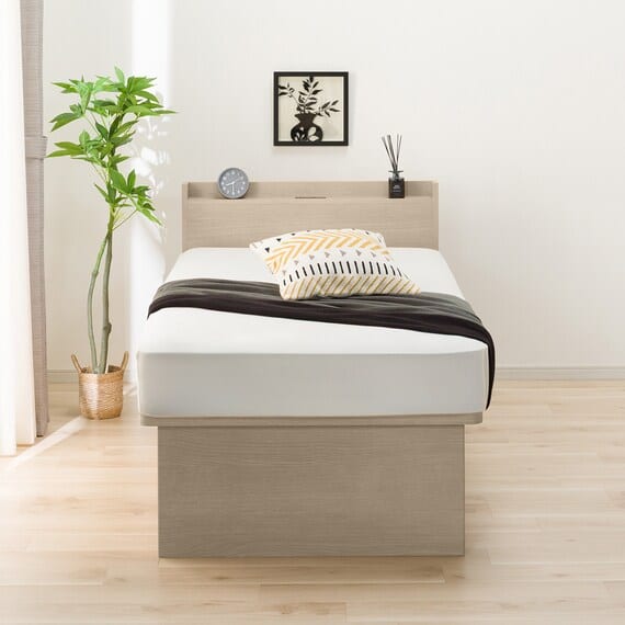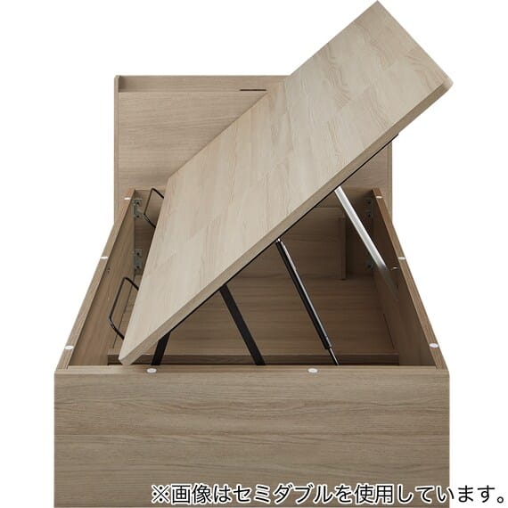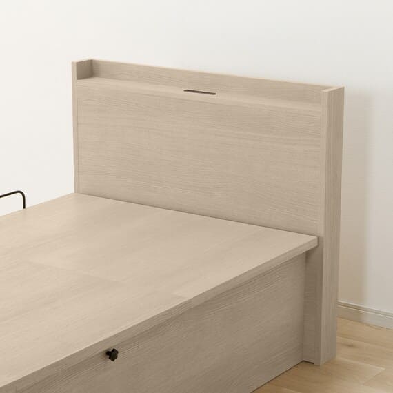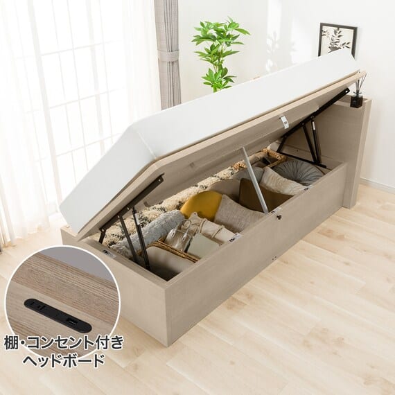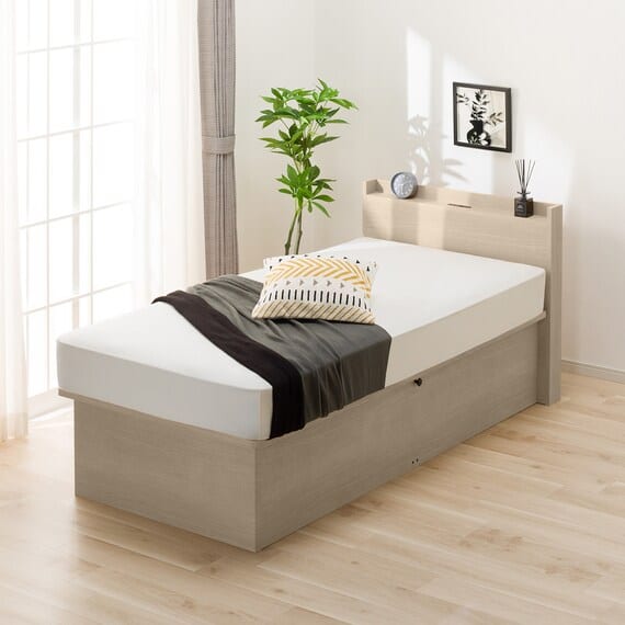 【N-ジオ】シリーズは、横開きと縦開きのタイプがあり、引出しに入らない大きなサイズの物も収納できるうえ、中身を一度に見渡せる大容量収納が魅力です。さらに、ヘッドボードを選べるため、お部屋の雰囲気やライフスタイルに合わせて自分好みのデザインを選びたい方におすすめです。シリンダーで跳ね上げをサポート。マットレスを載せたままラクラク開閉が可能です。