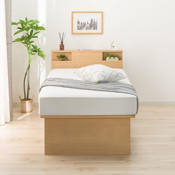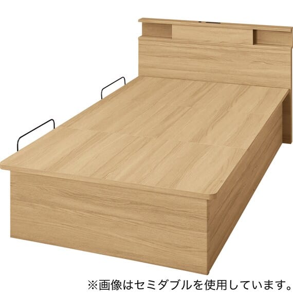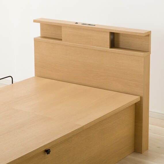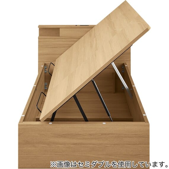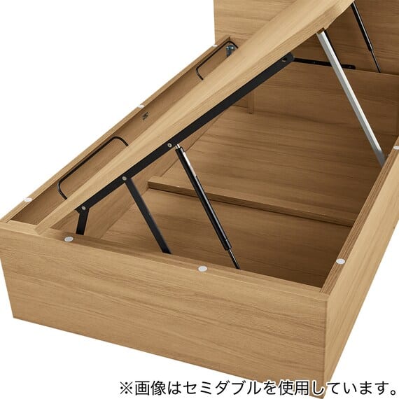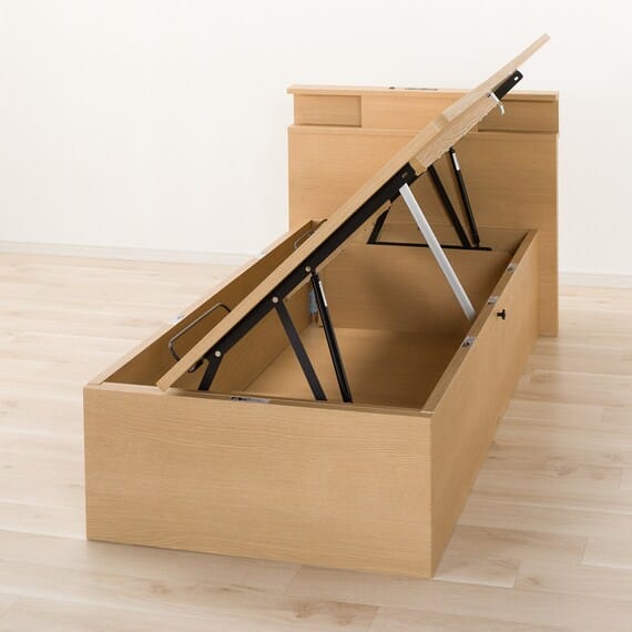 【N-ジオ】シリーズは、横開きと縦開きのタイプがあり、引出しに入らない大きなサイズの物も収納できるうえ、中身を一度に見渡せる大容量収納が魅力です。さらに、ヘッドボードを選べるため、お部屋の雰囲気やライフスタイルに合わせて自分好みのデザインを選びたい方におすすめです。シリンダーで跳ね上げをサポート。マットレスを載せたままラクラク開閉が可能です。