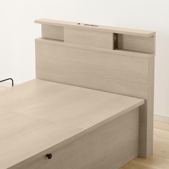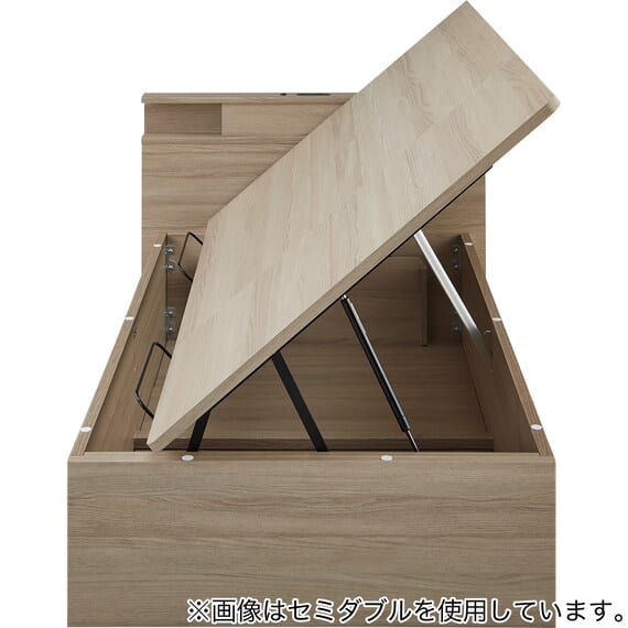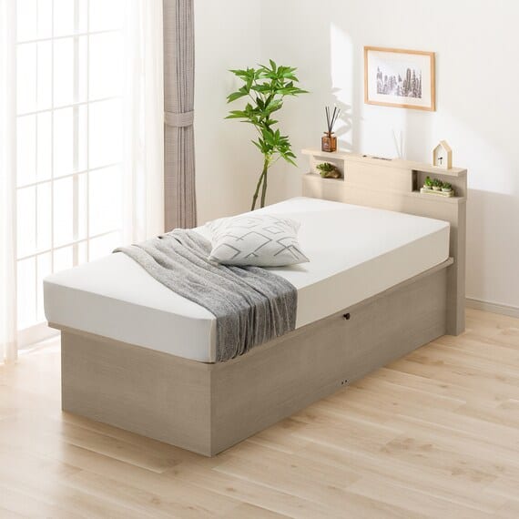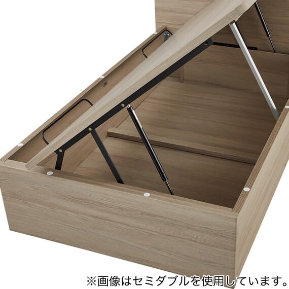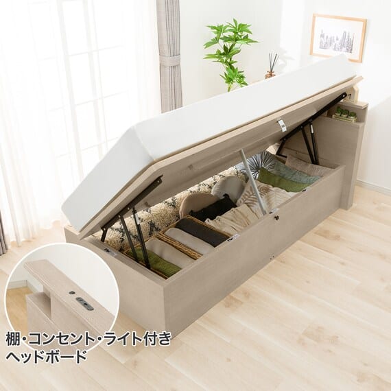 【N-ジオ】シリーズは、横開きと縦開きのタイプがあり、引出しに入らない大きなサイズの物も収納できるうえ、中身を一度に見渡せる大容量収納が魅力です。さらに、ヘッドボードを選べるため、お部屋の雰囲気やライフスタイルに合わせて自分好みのデザインを選びたい方におすすめです。シリンダーで跳ね上げをサポート。マットレスを載せたままラクラク開閉が可能です。