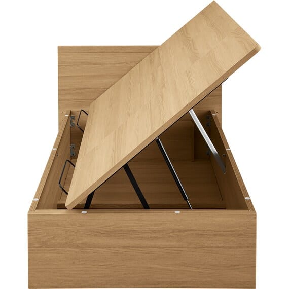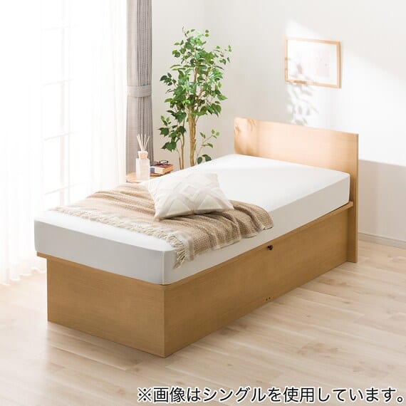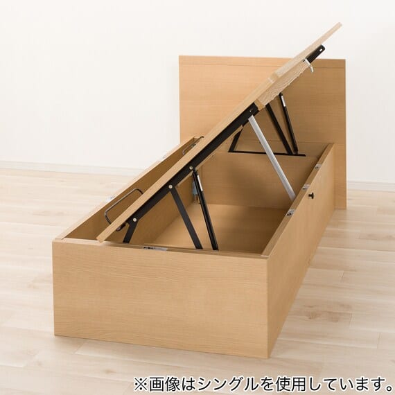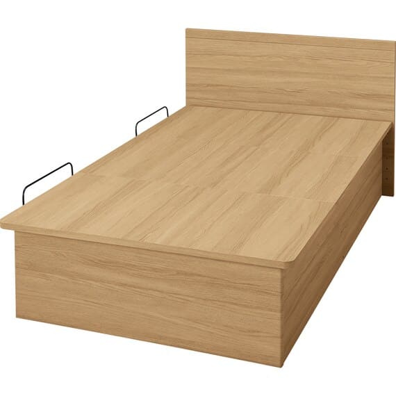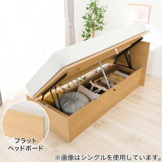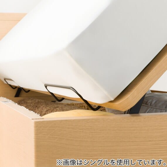 【N-ジオ】シリーズは、横開きと縦開きのタイプがあり、引出しに入らない大きなサイズの物も収納できるうえ、中身を一度に見渡せる大容量収納が魅力です。さらに、ヘッドボードを選べるため、お部屋の雰囲気やライフスタイルに合わせて自分好みのデザインを選びたい方におすすめです。シリンダーで跳ね上げをサポート。マットレスを載せたままラクラク開閉が可能です。