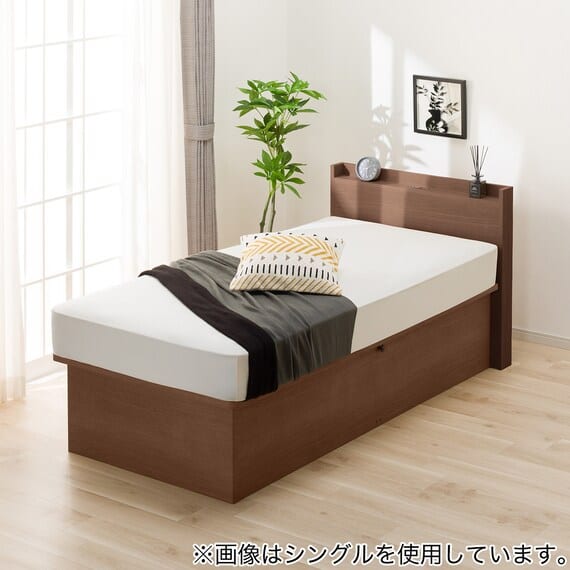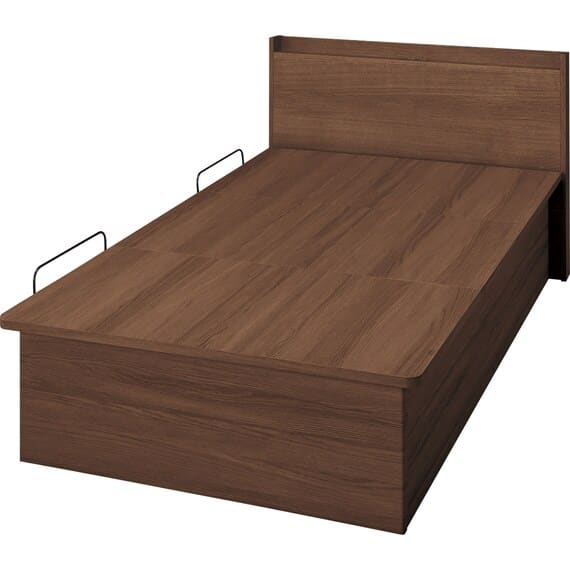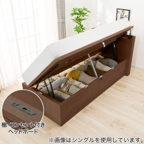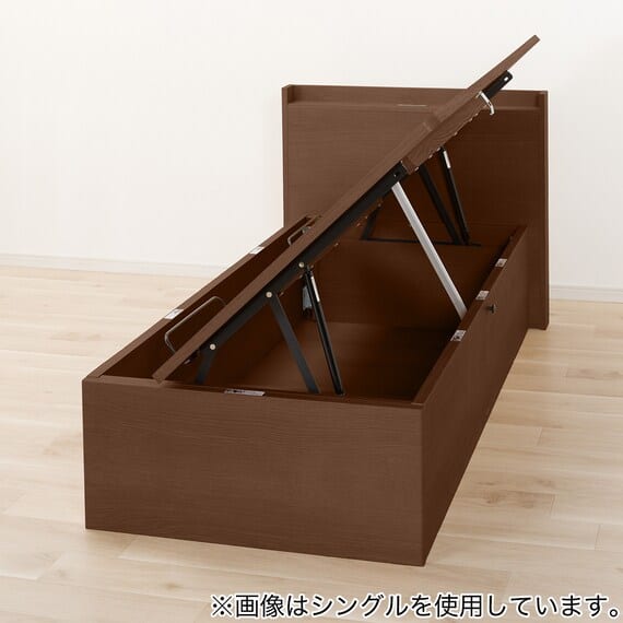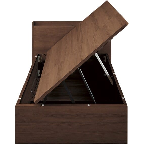 【N-ジオ】シリーズは、横開きと縦開きのタイプがあり、引出しに入らない大きなサイズの物も収納できるうえ、中身を一度に見渡せる大容量収納が魅力です。さらに、ヘッドボードを選べるため、お部屋の雰囲気やライフスタイルに合わせて自分好みのデザインを選びたい方におすすめです。シリンダーで跳ね上げをサポート。マットレスを載せたままラクラク開閉が可能です。